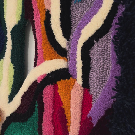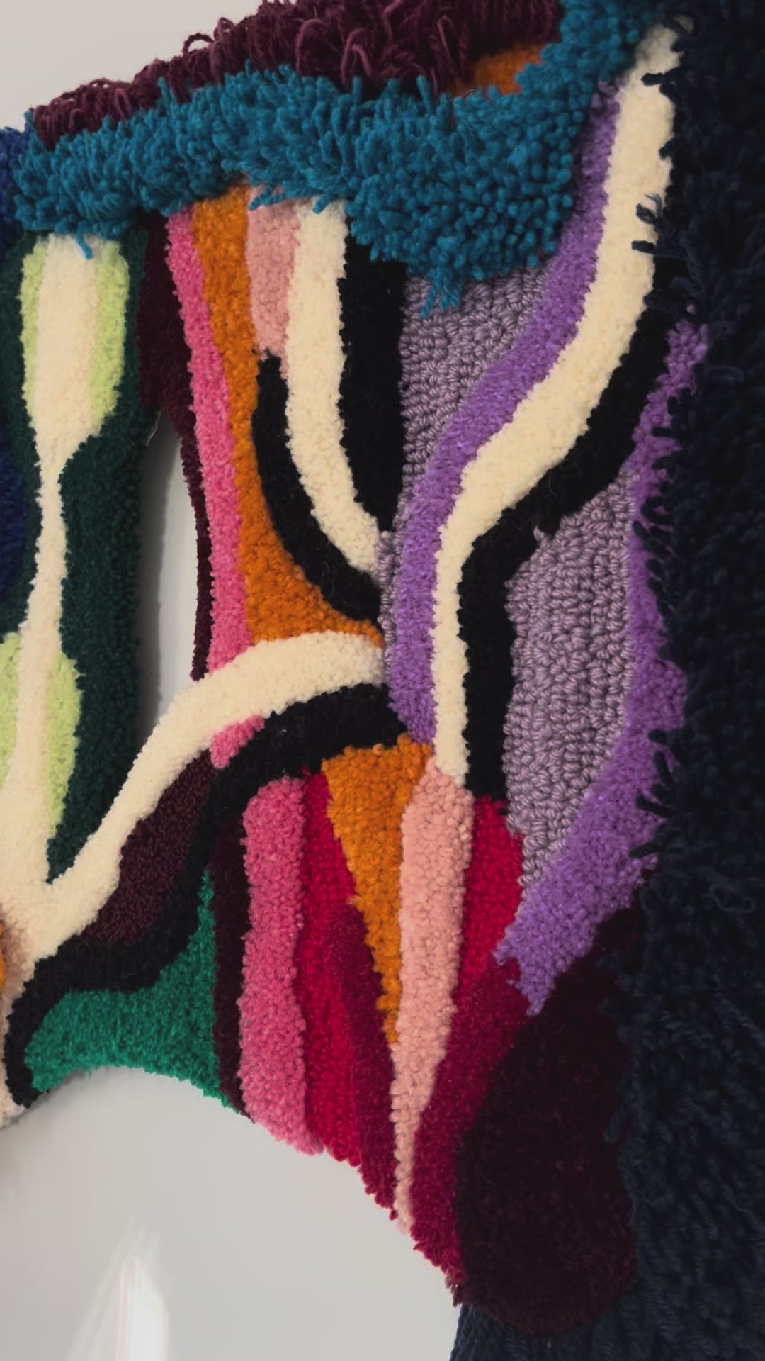 A one-of-a-kind handmade wool wall rug featuring bold colors, organic shapes, and layered textures. This piece brings movement and energy into the space, combining soft transitions with high-contrast elements for a visually striking composition.