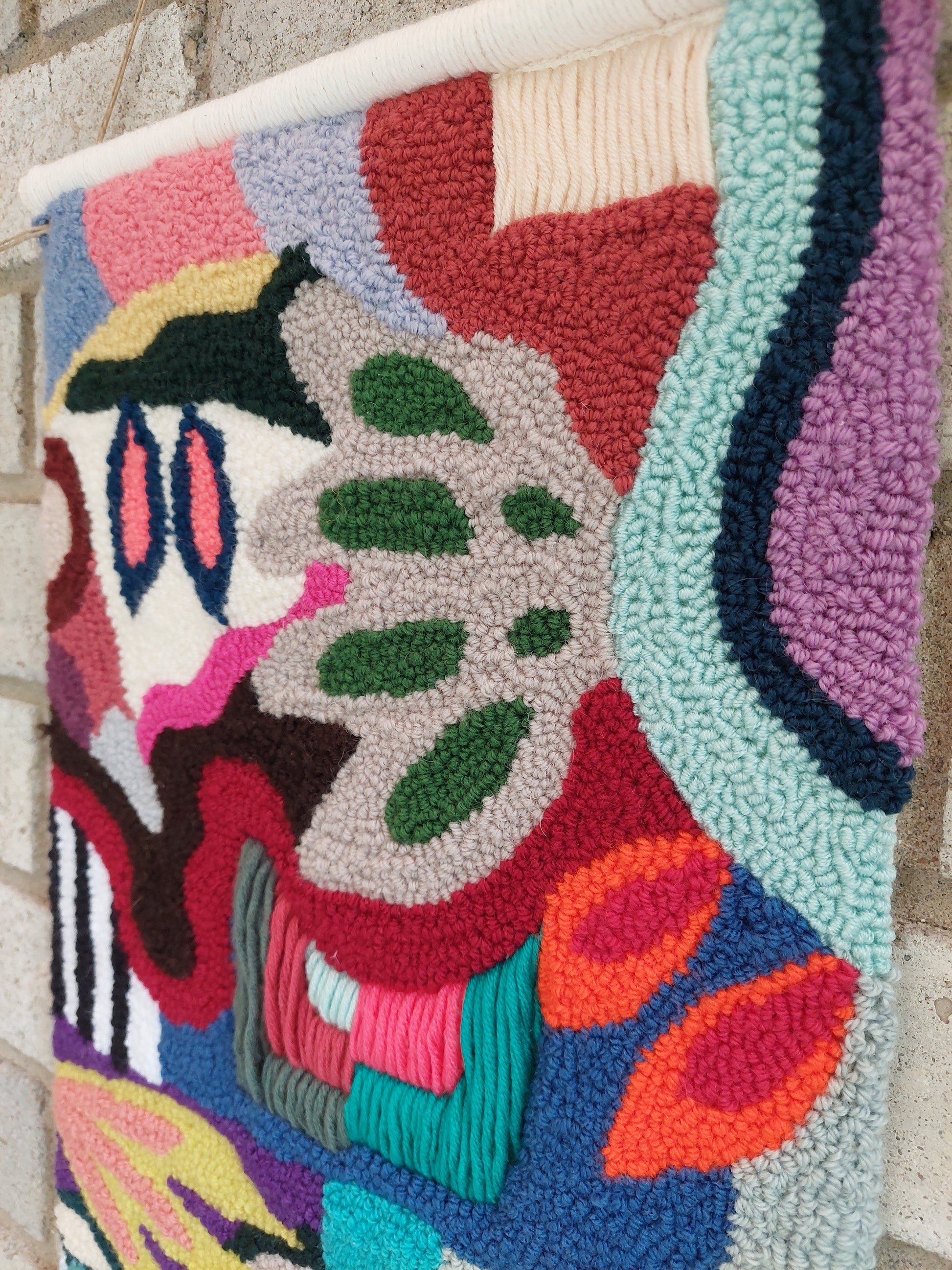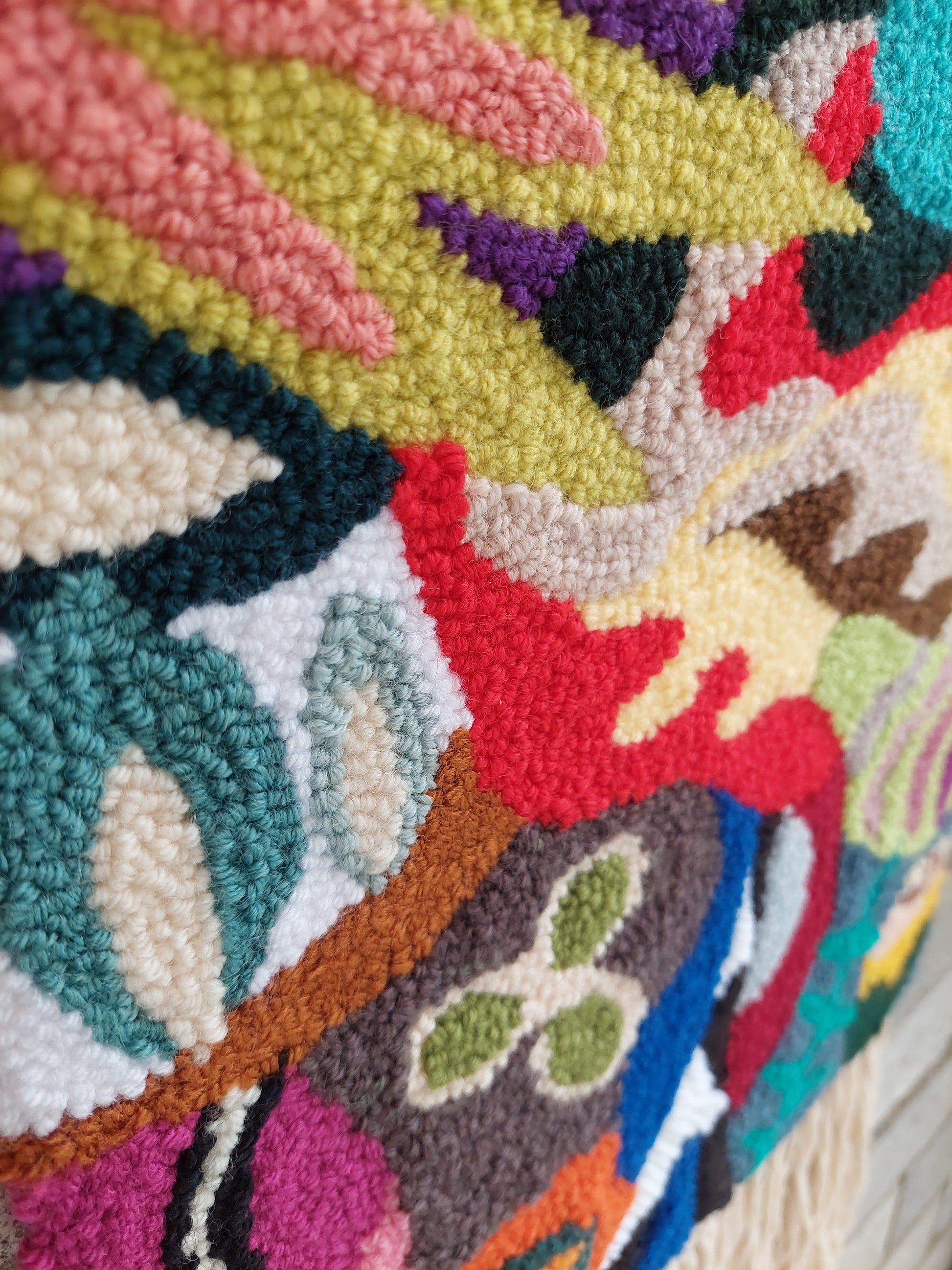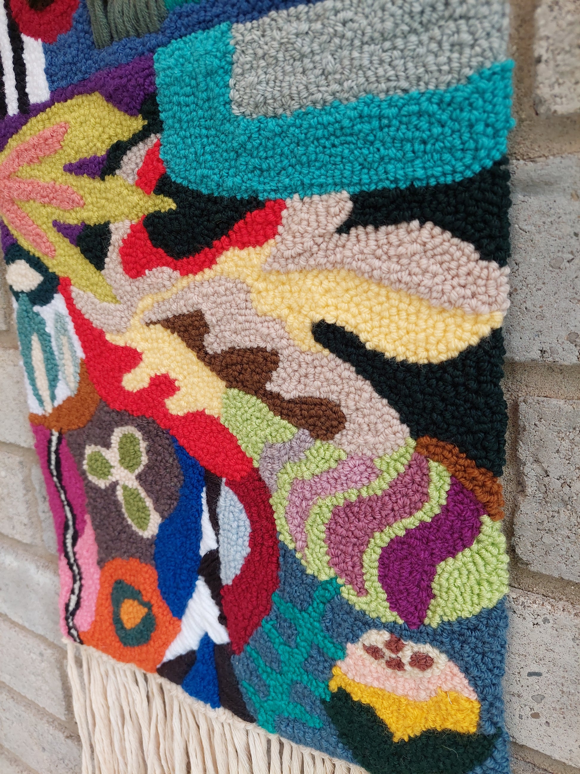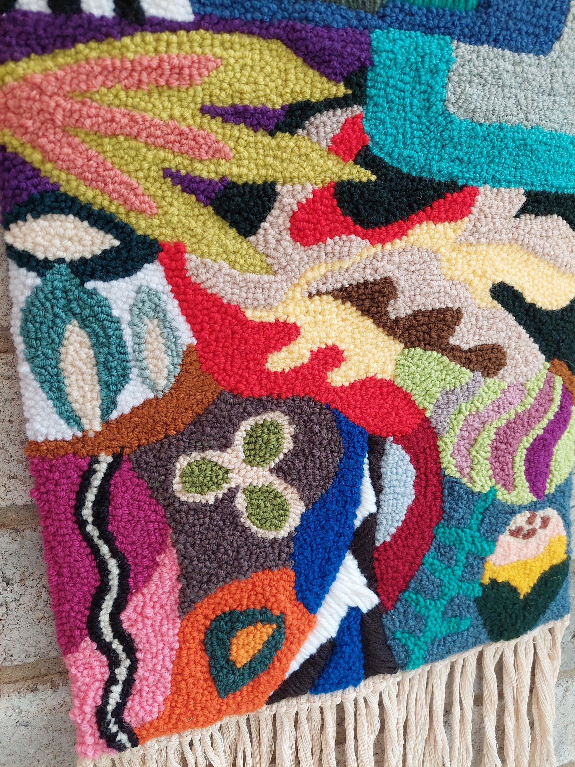 A wall rug with cheerful colors that will make a difference in your space. This wall rug is completely handmade using the punch needle technique. This wall rug be placed on corners or on narrow walls. It makes all the difference in decoration.