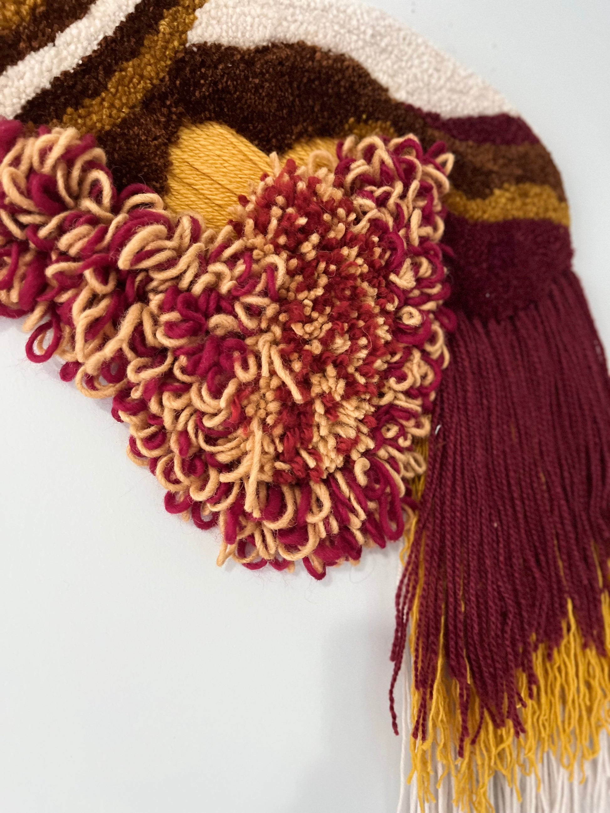 The color palette is rich: deep crimson, golden mustard, and cream. The piece features a dramatic texture contrast, combining dense looped areas with a prominent central cluster of long, shaggy yarn.