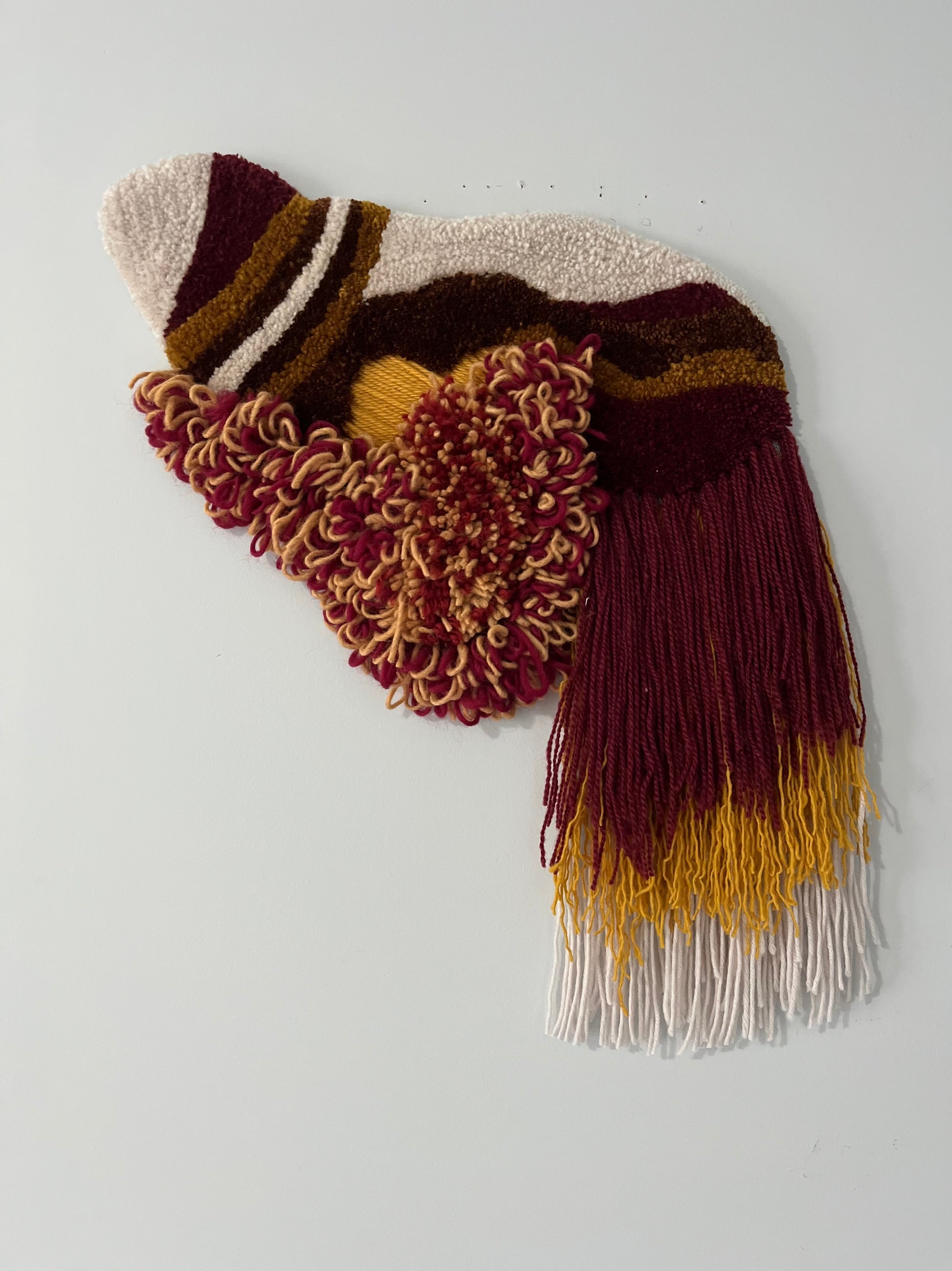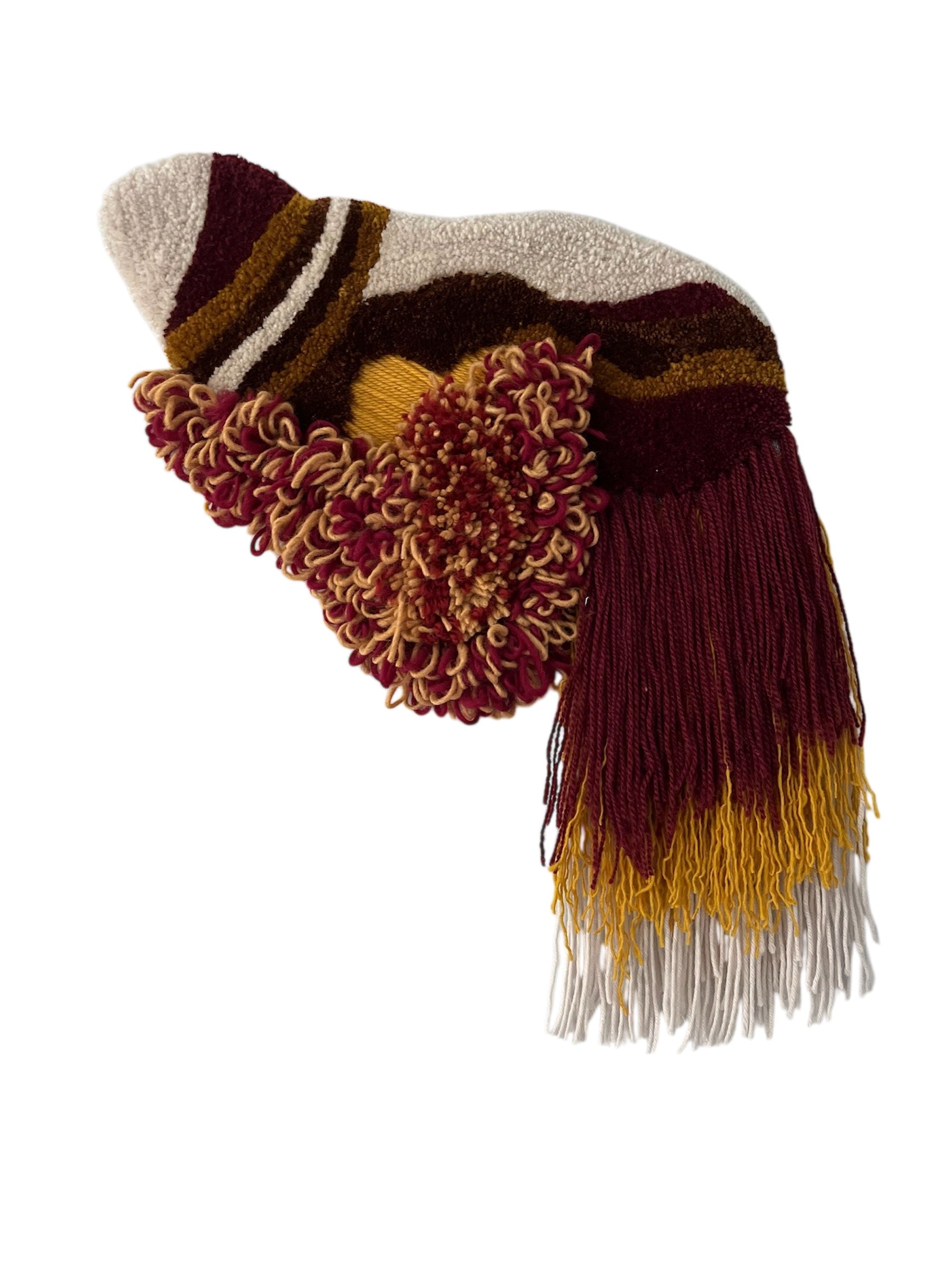 This is a small, vibrant textile sculpture, crafted using the tufting/punch needle technique. Its abstract and irregular shape makes it a unique art piece.