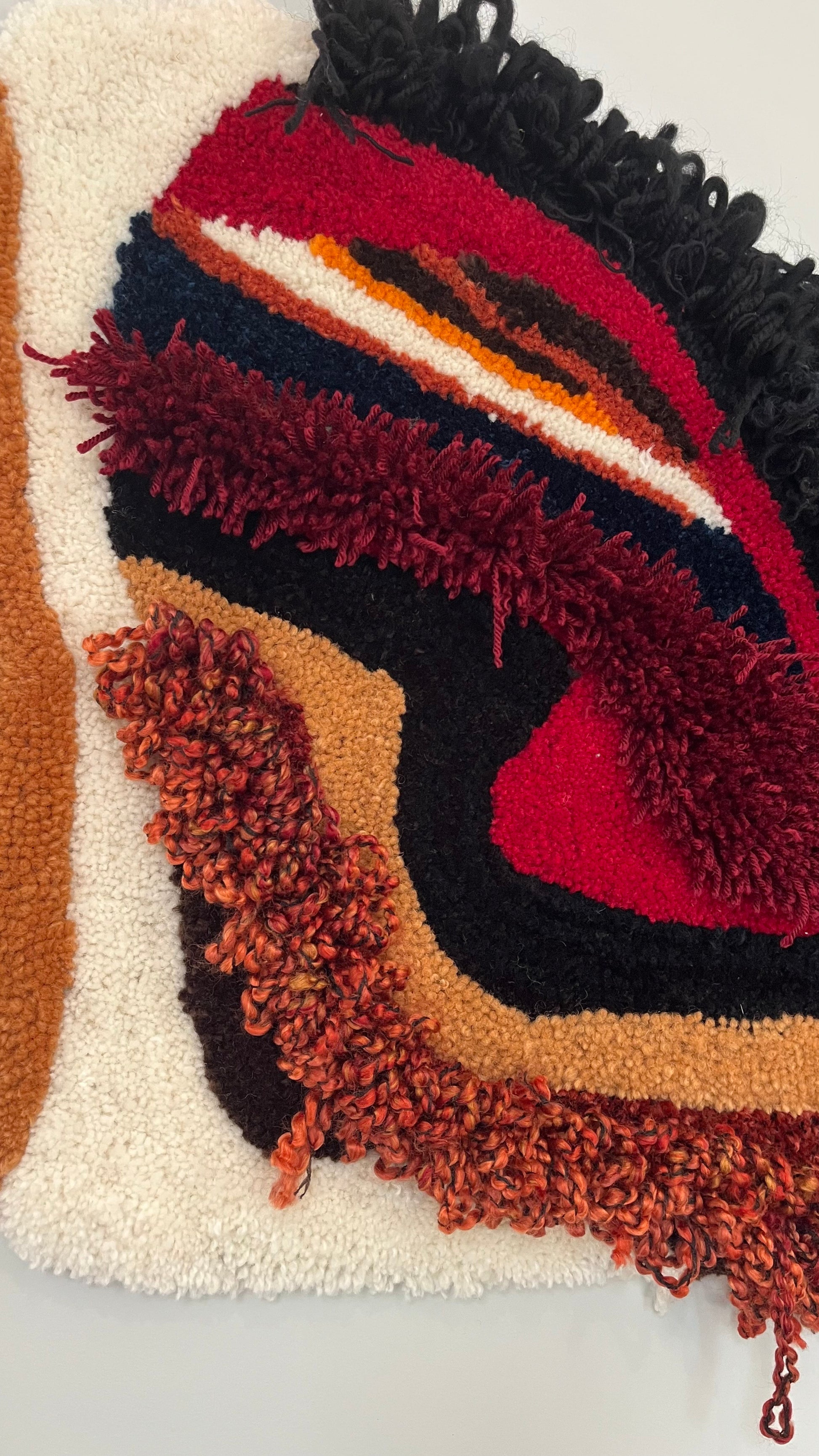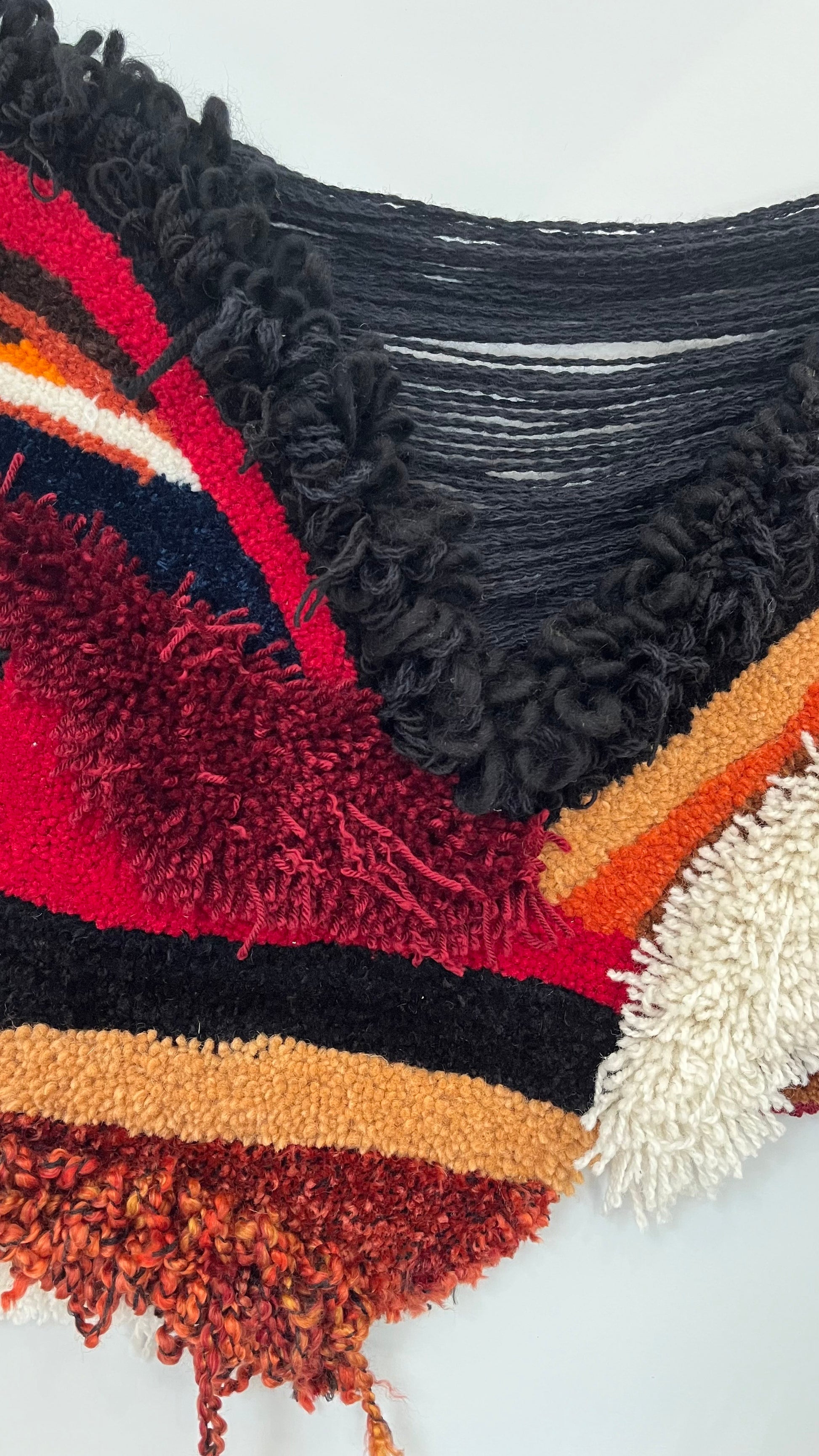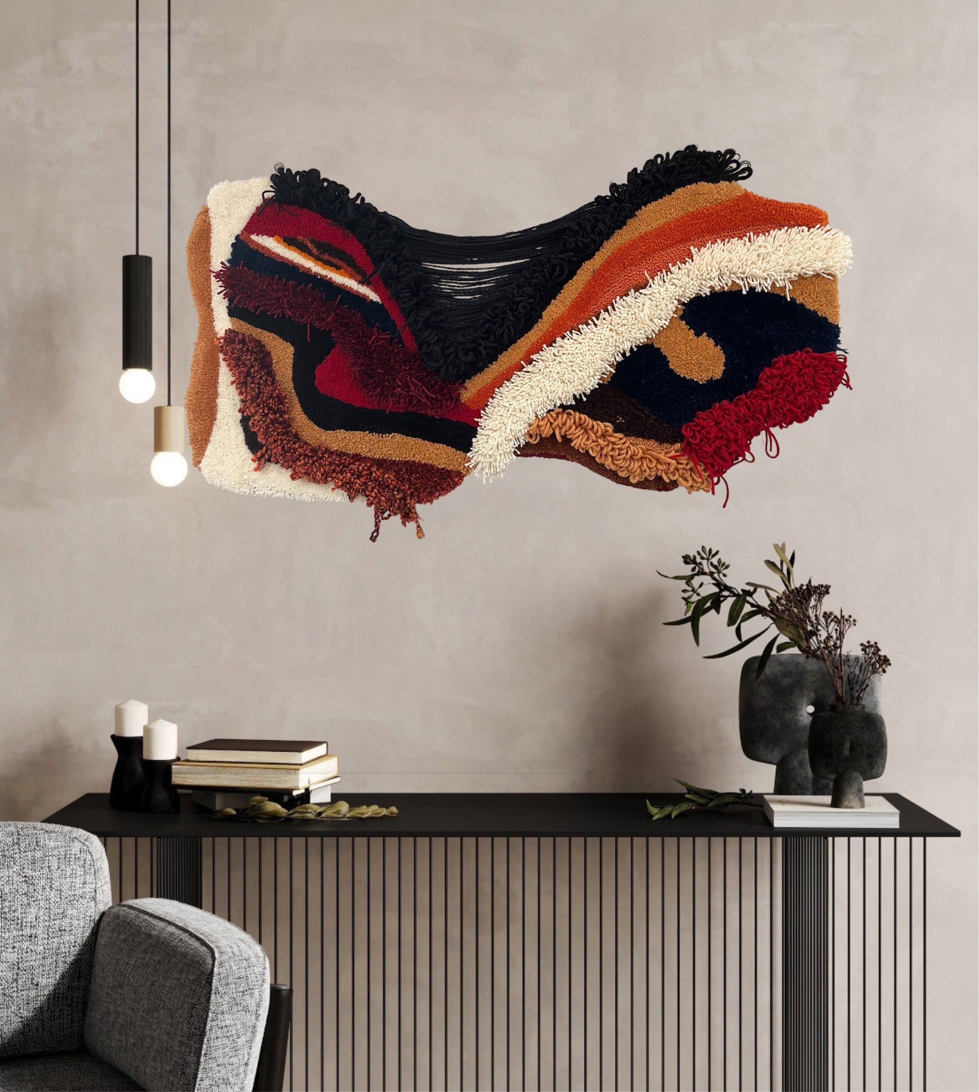 This three-dimensional textile piece is a celebration of organic form and texture. With its fluid, dynamic design, it weaves together earthy tones, deep black, crimson red, caramel, and soft cream, creating a visual rhythm that evokes geological formations.