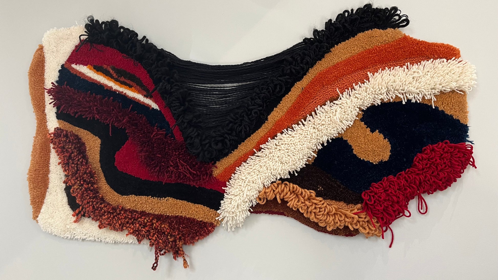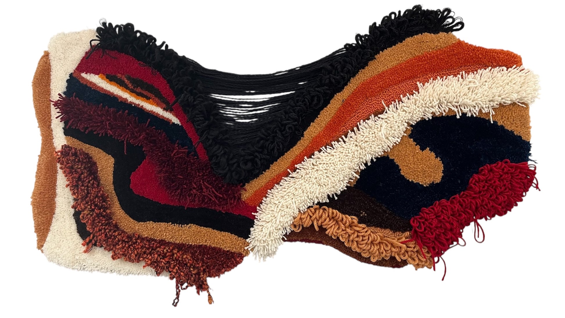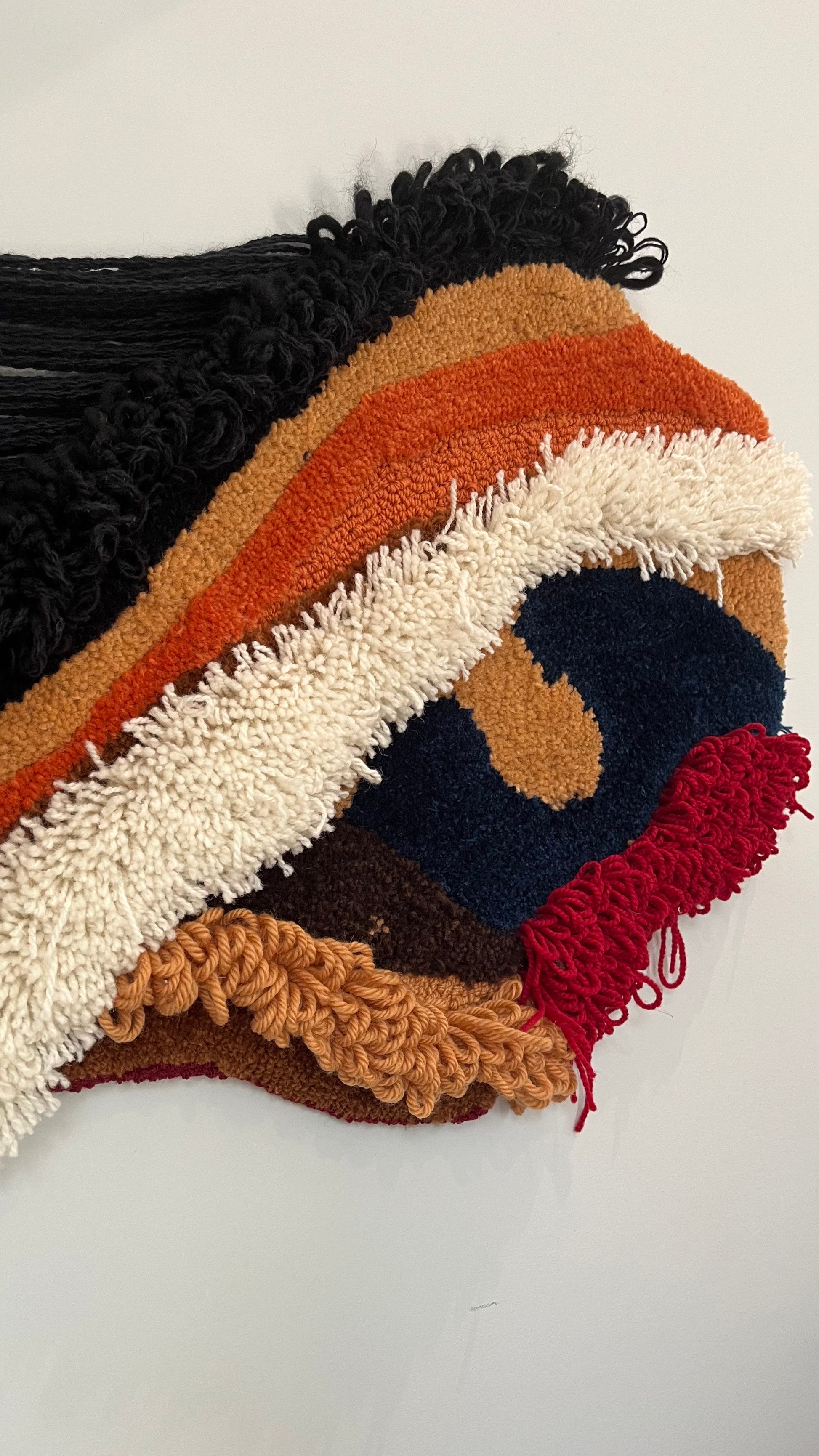 This three-dimensional textile piece is a celebration of organic form and texture. With its fluid, dynamic design, it weaves together earthy tones, deep black, crimson red, caramel, and soft cream, creating a visual rhythm that evokes geological formations.
