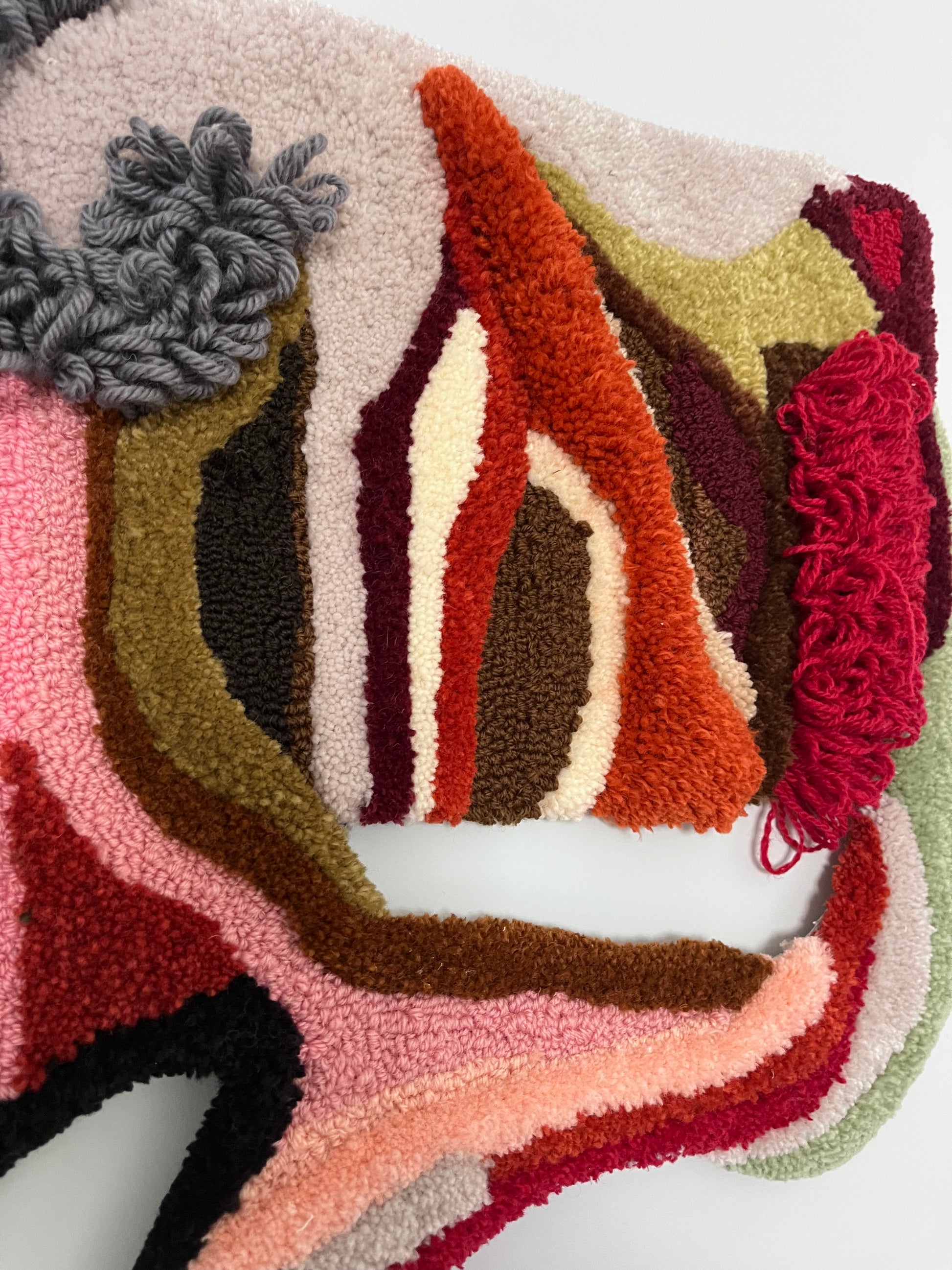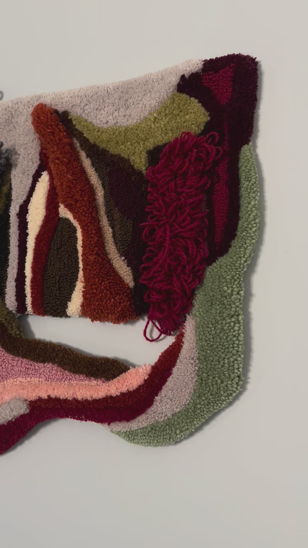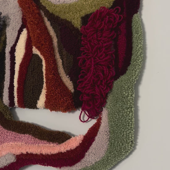 A unique handmade wool wall rug featuring organic shapes and layered textures. This piece brings warmth, depth, and a sculptural presence to any space, functioning as a textile artwork rather than a floor rug.