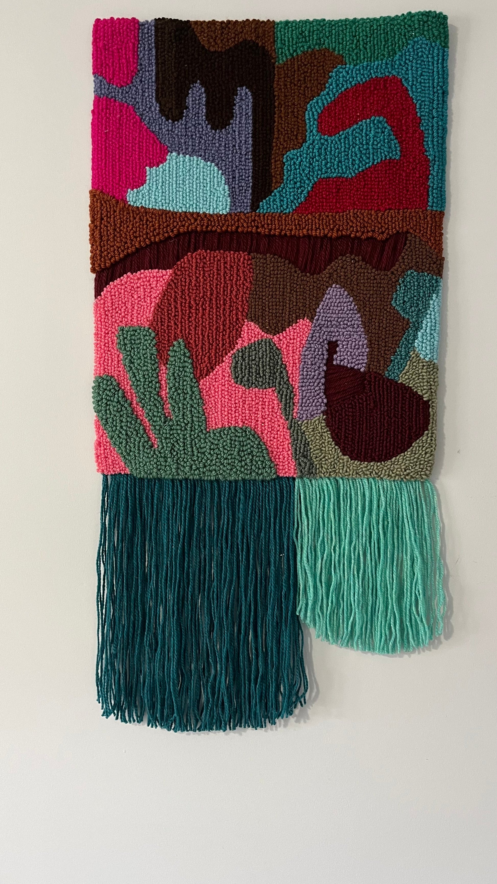 This handmade tufted wall rug celebrates organic forms and vibrant contrasts. Inspired by nature’s layered landscapes, it blends warm earthy tones with bold bursts of pink, teal, and turquoise — creating a playful yet harmonious composition.