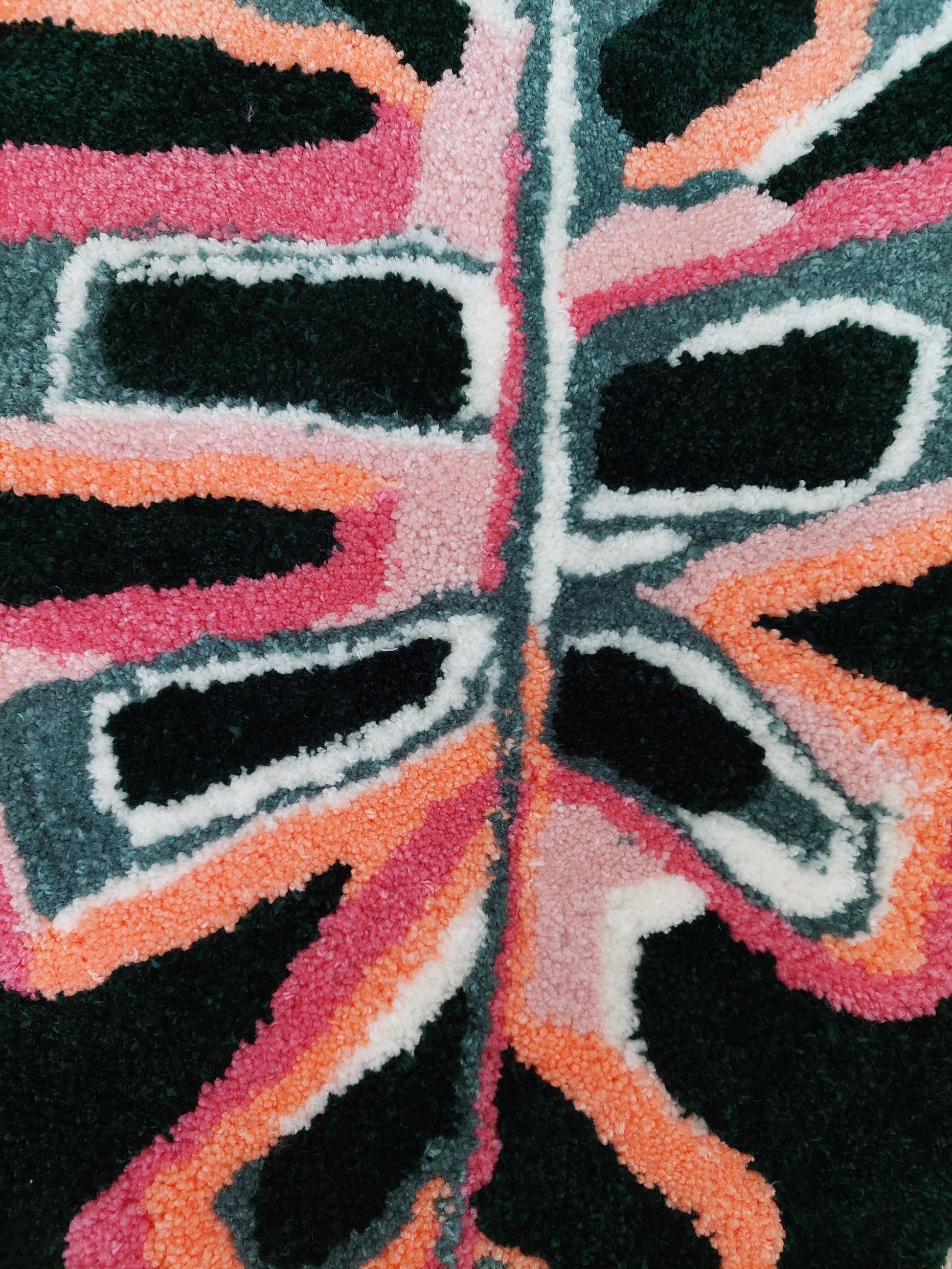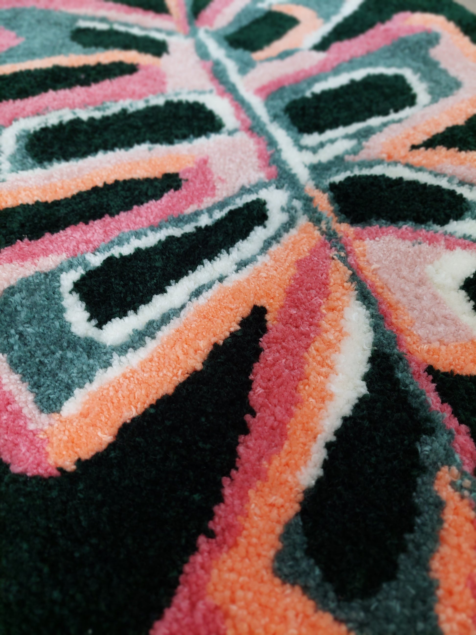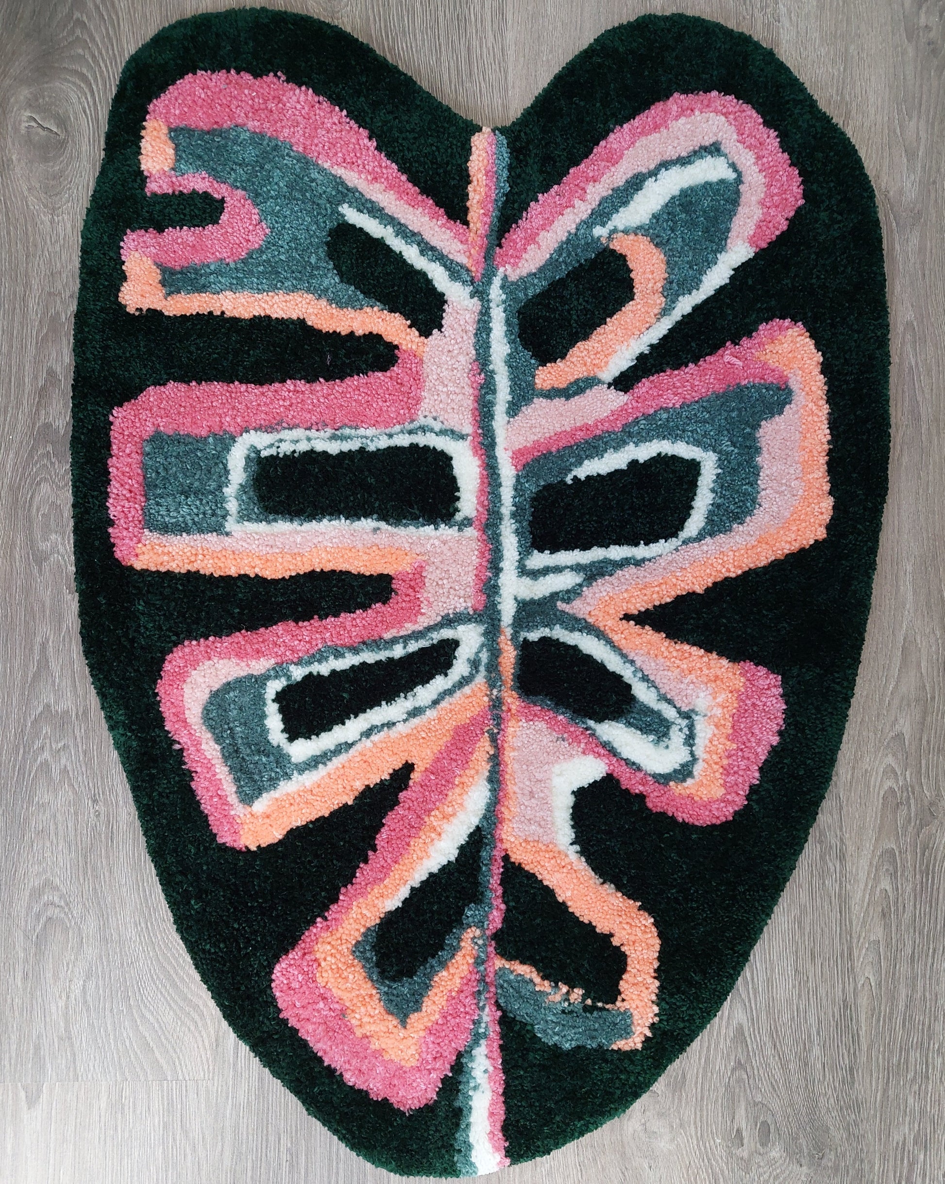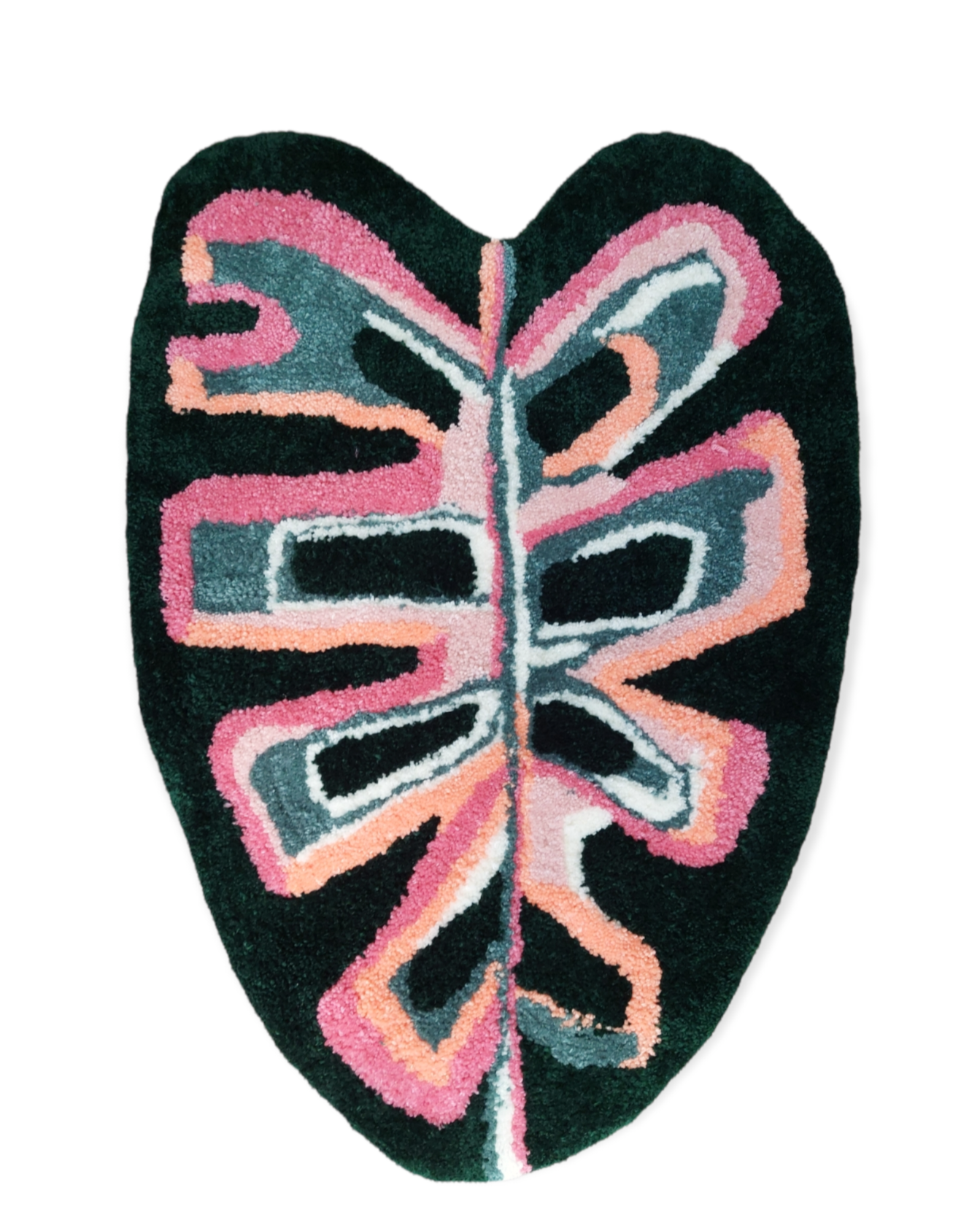 Rugs are versatile, cool and comfortable. This one, made entirely by hand, depicts the famous Monstera leaf in an abstract way.