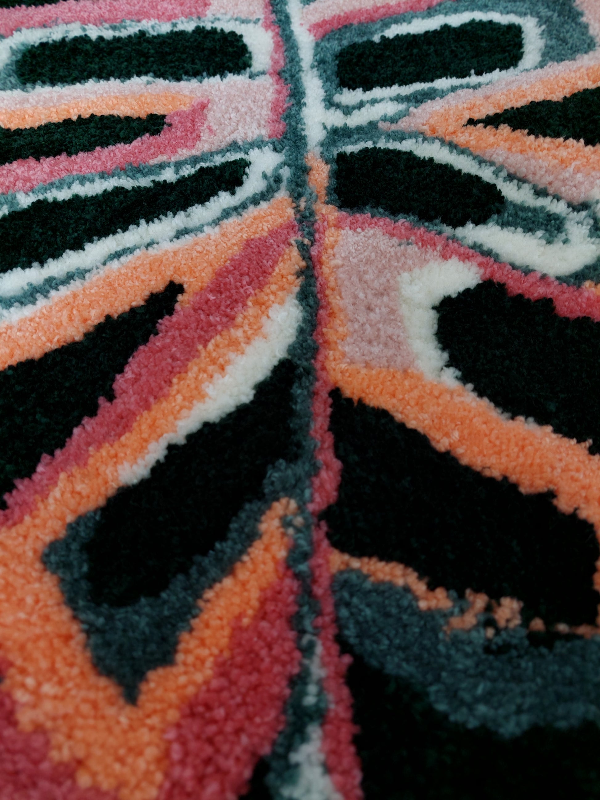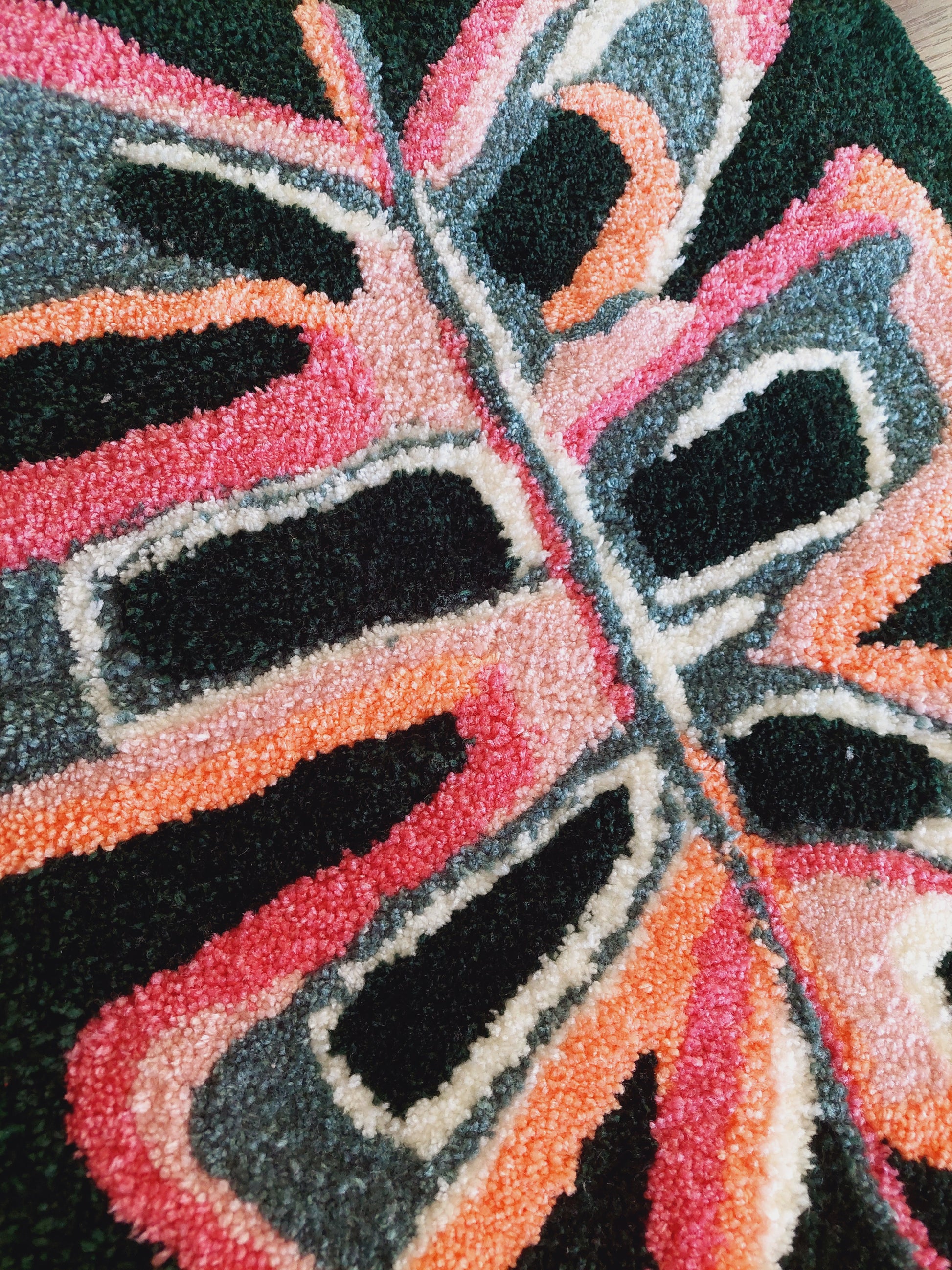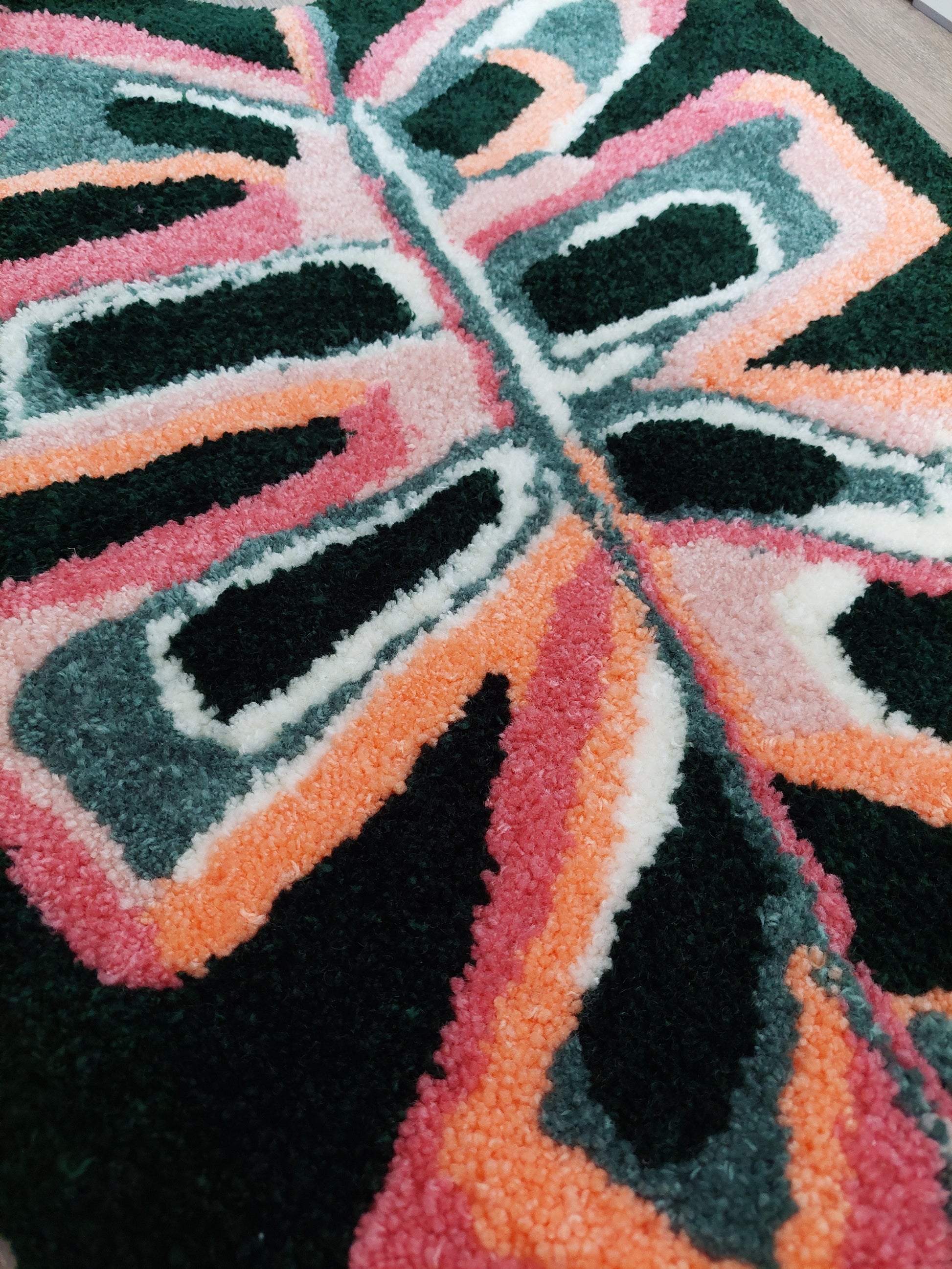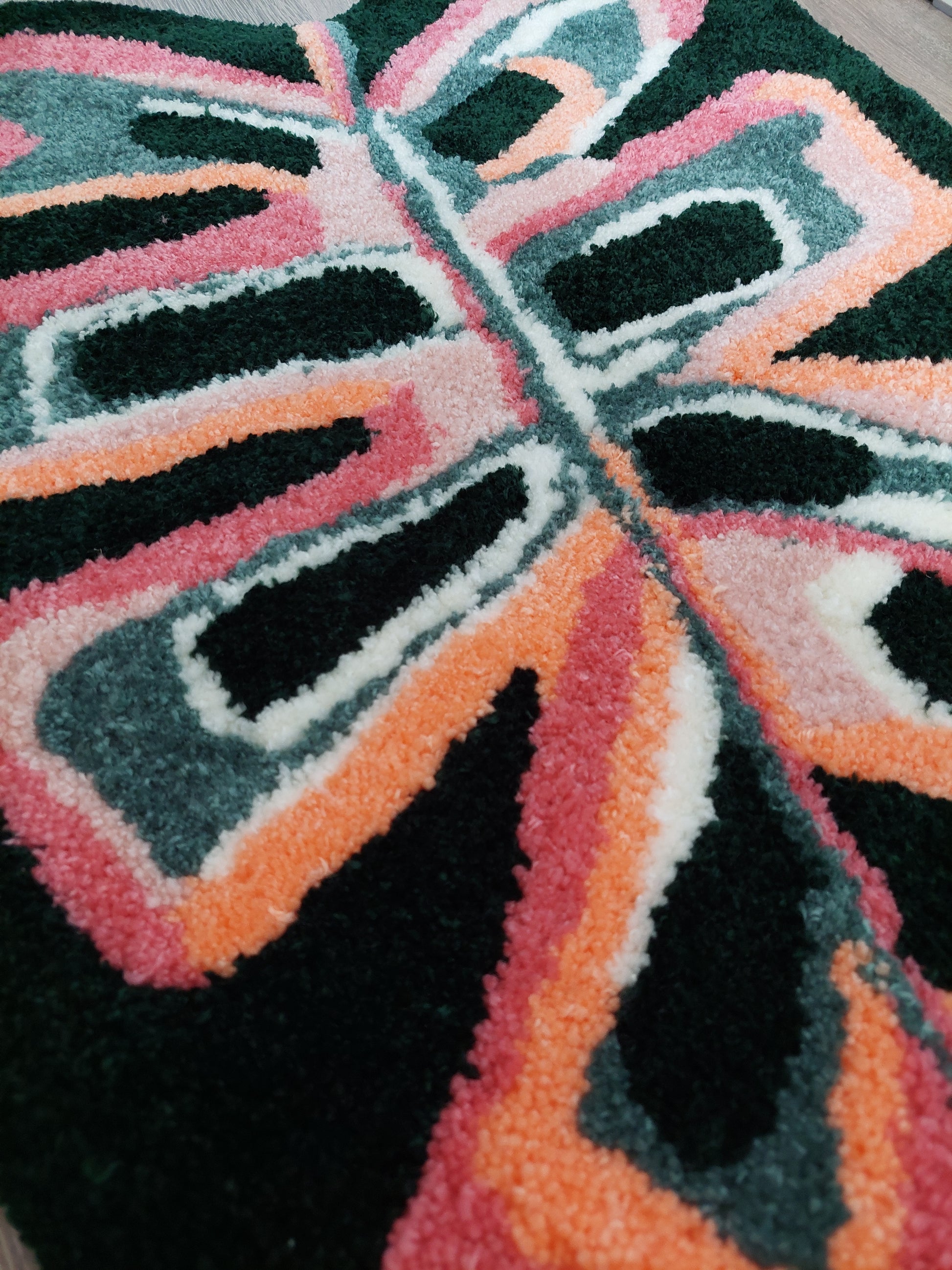 Rugs are versatile, cool and comfortable. This one, made entirely by hand, depicts the famous Monstera leaf in an abstract way.