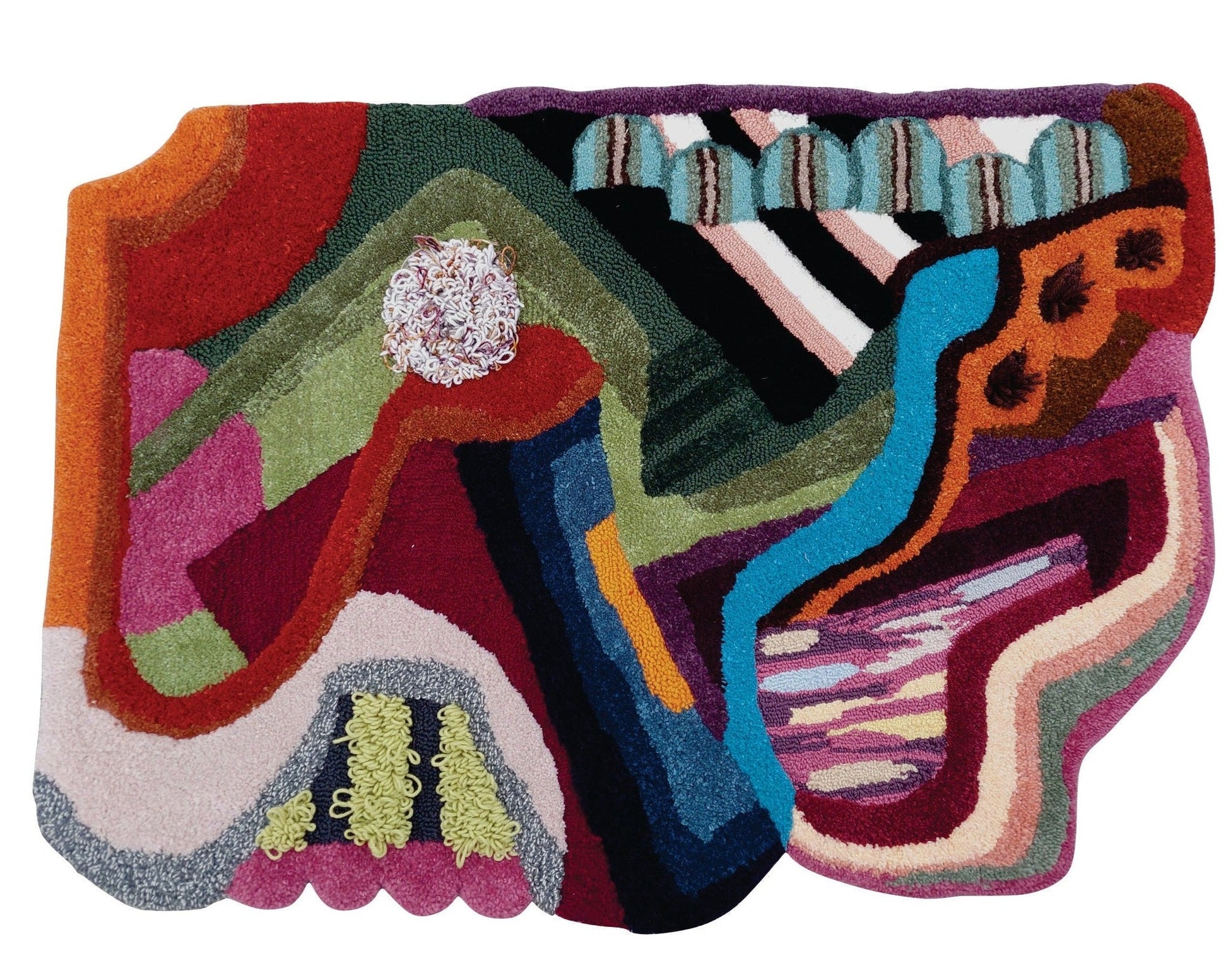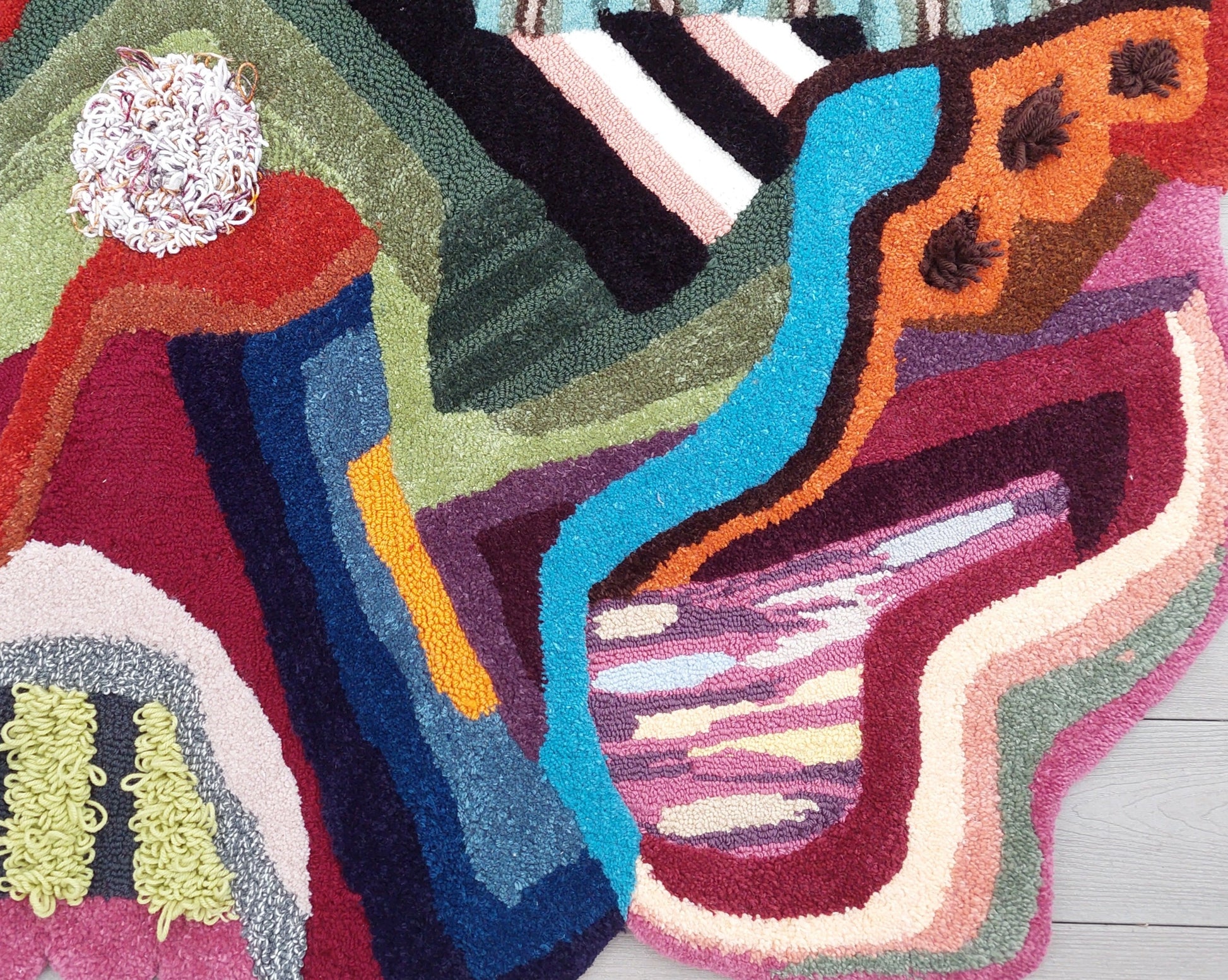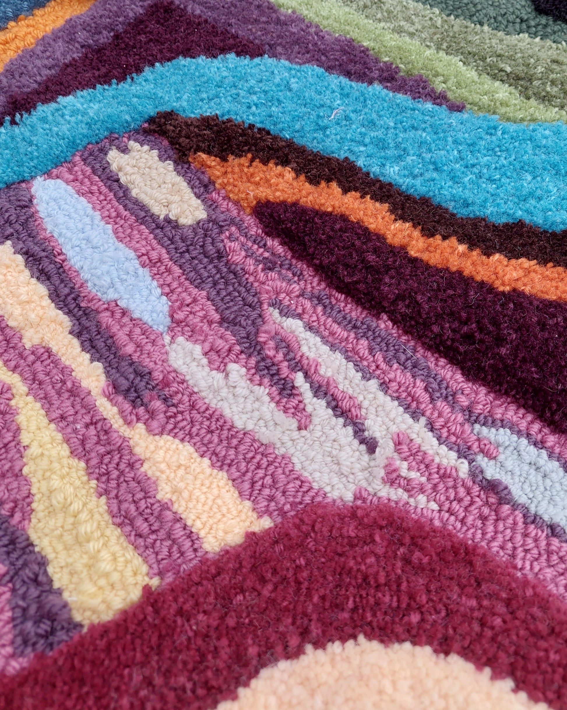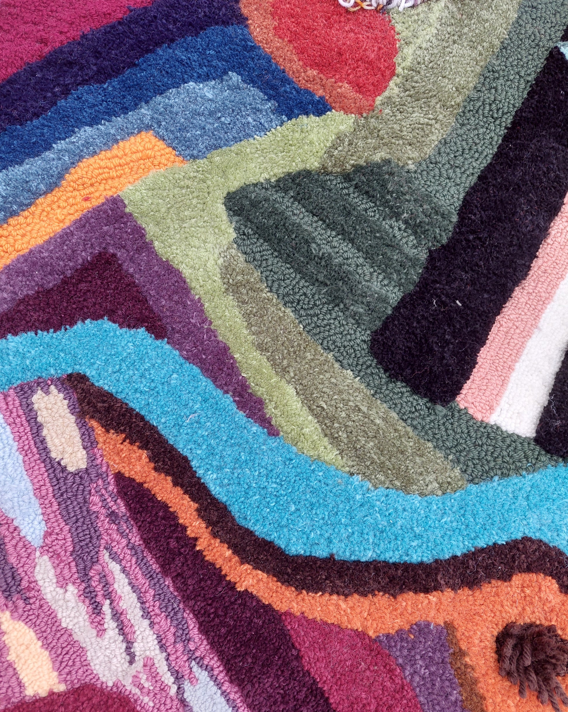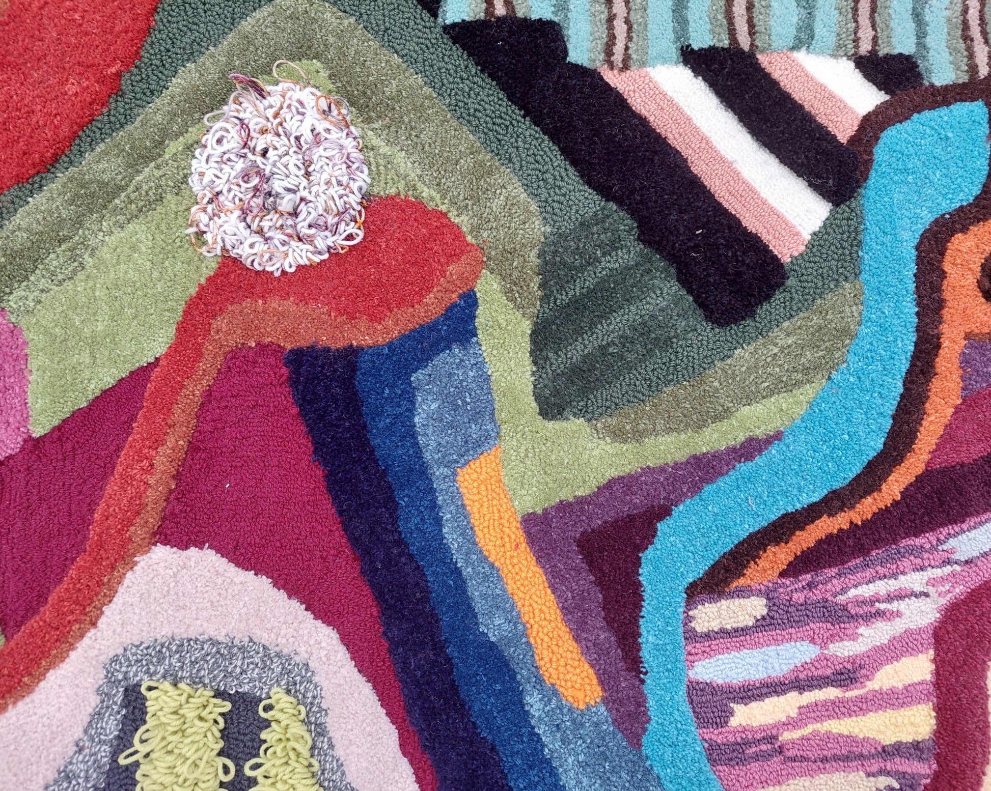 Wall rug made with the tufting process and with punch needles. Details for textures, colors and forms. Organic design.