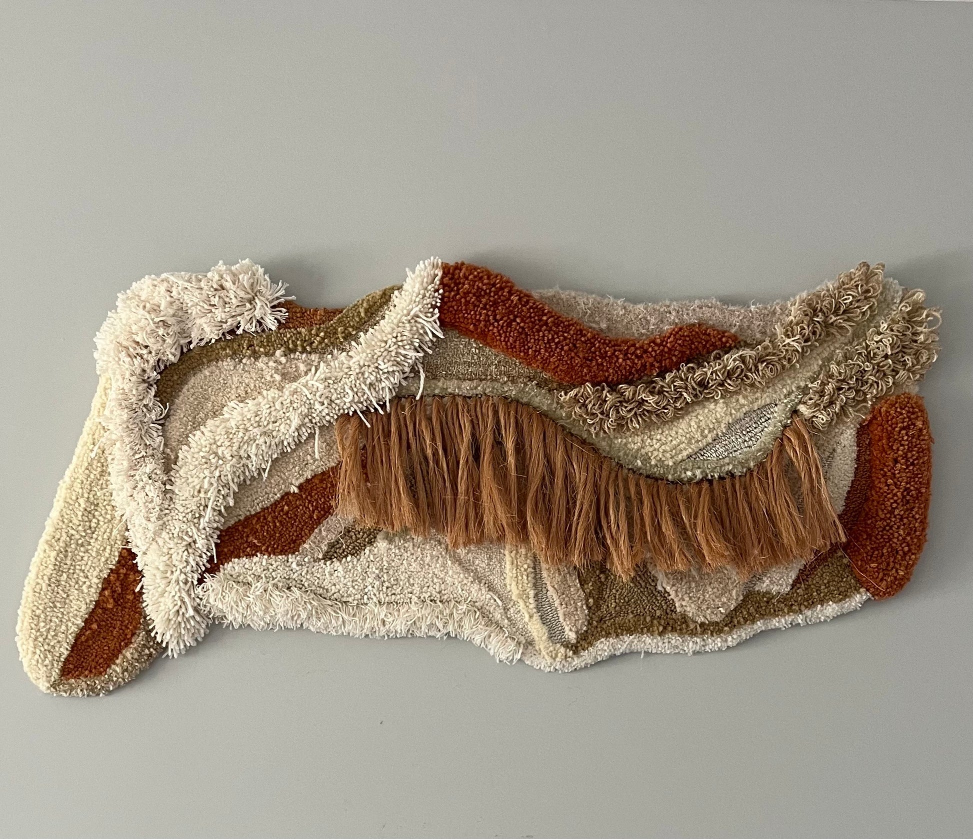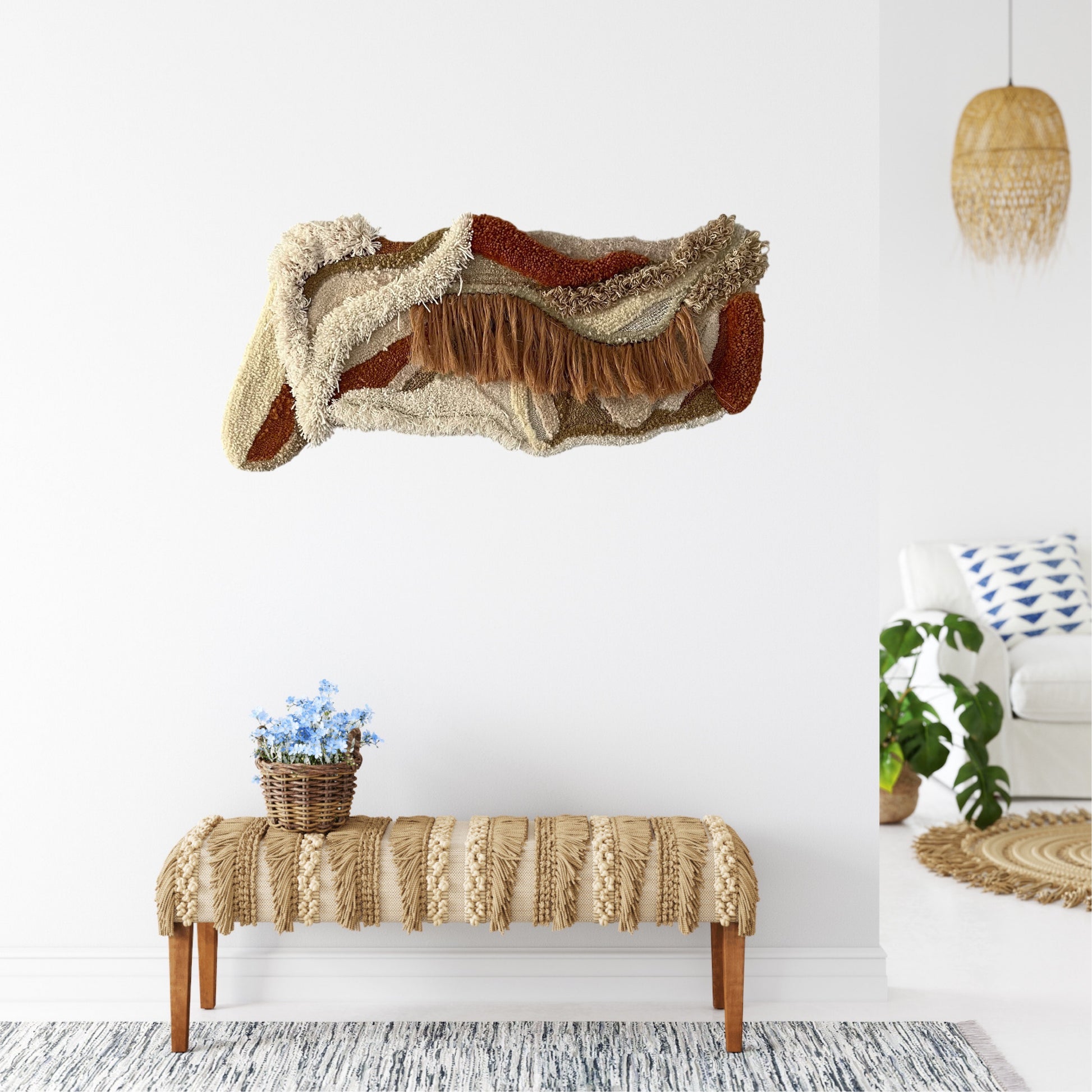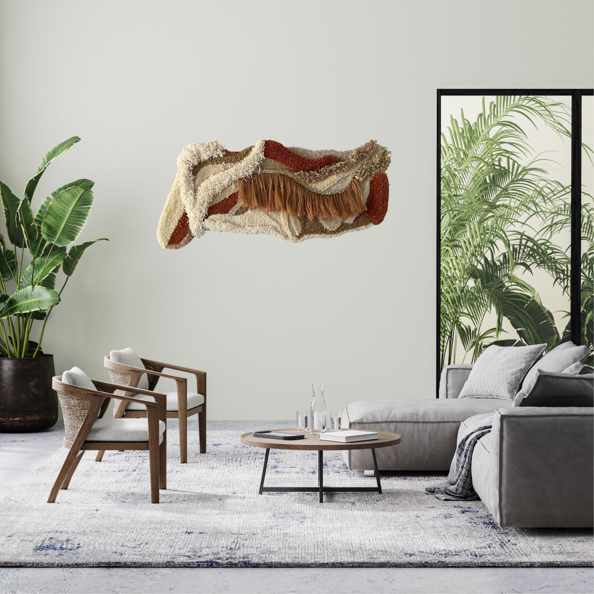 This unique wall rug is a true piece of textile art, handcrafted using tufting techniques that explore a variety of textures, volumes, and layers. Featuring warm earthy tones like beige, rust, caramel, and natural brown, it brings a sense of organic movement and rustic sophistication to any space.