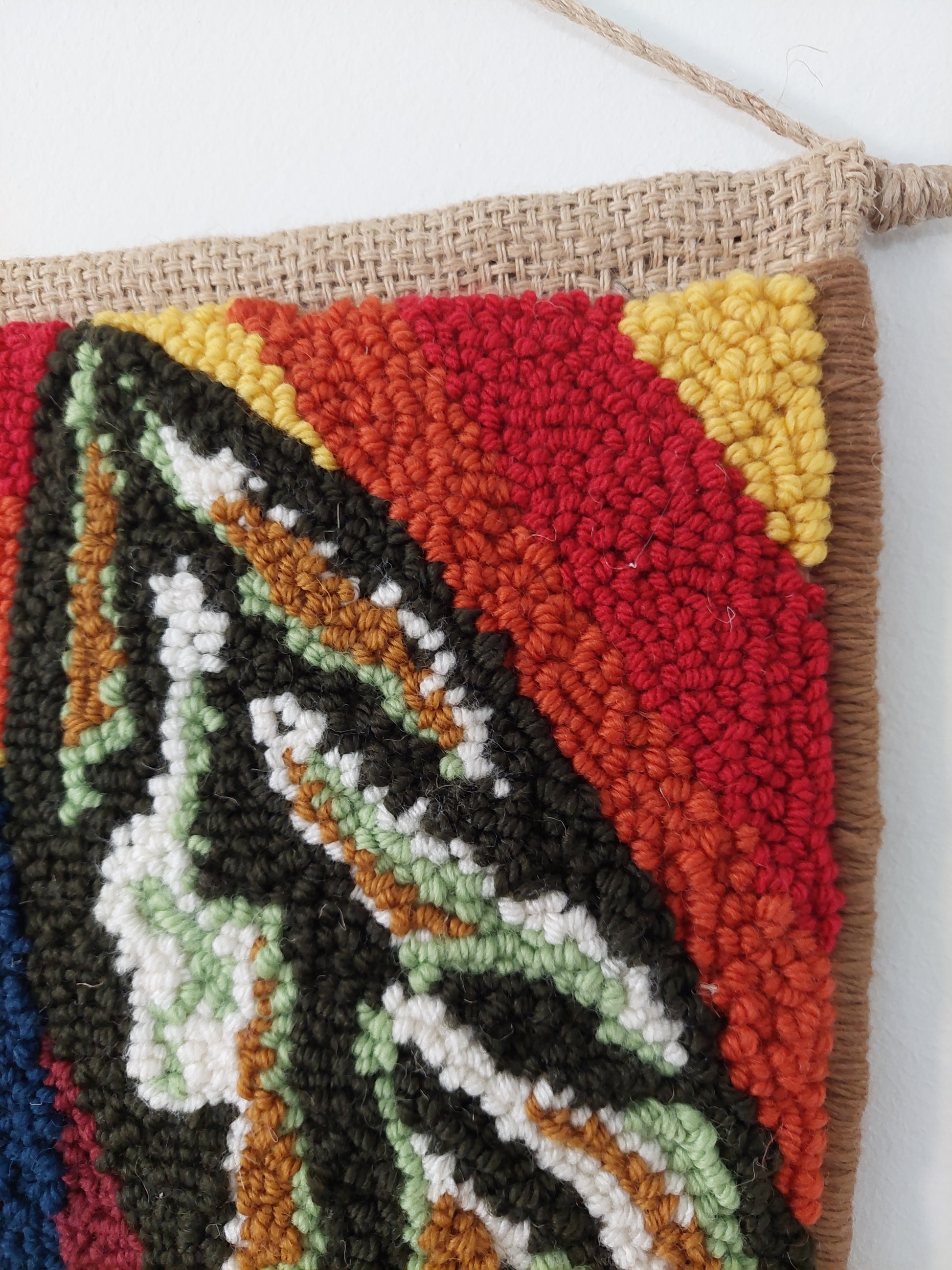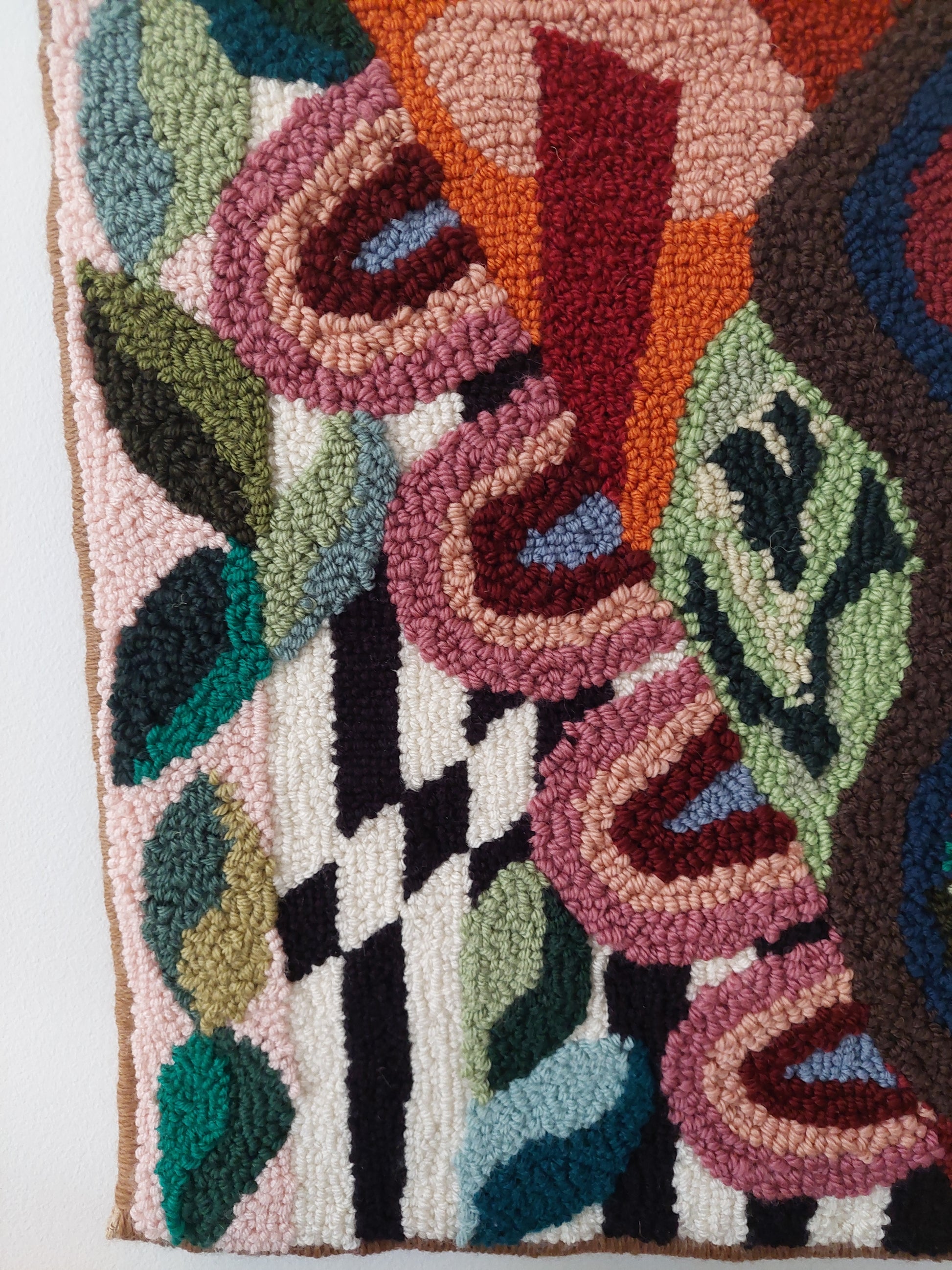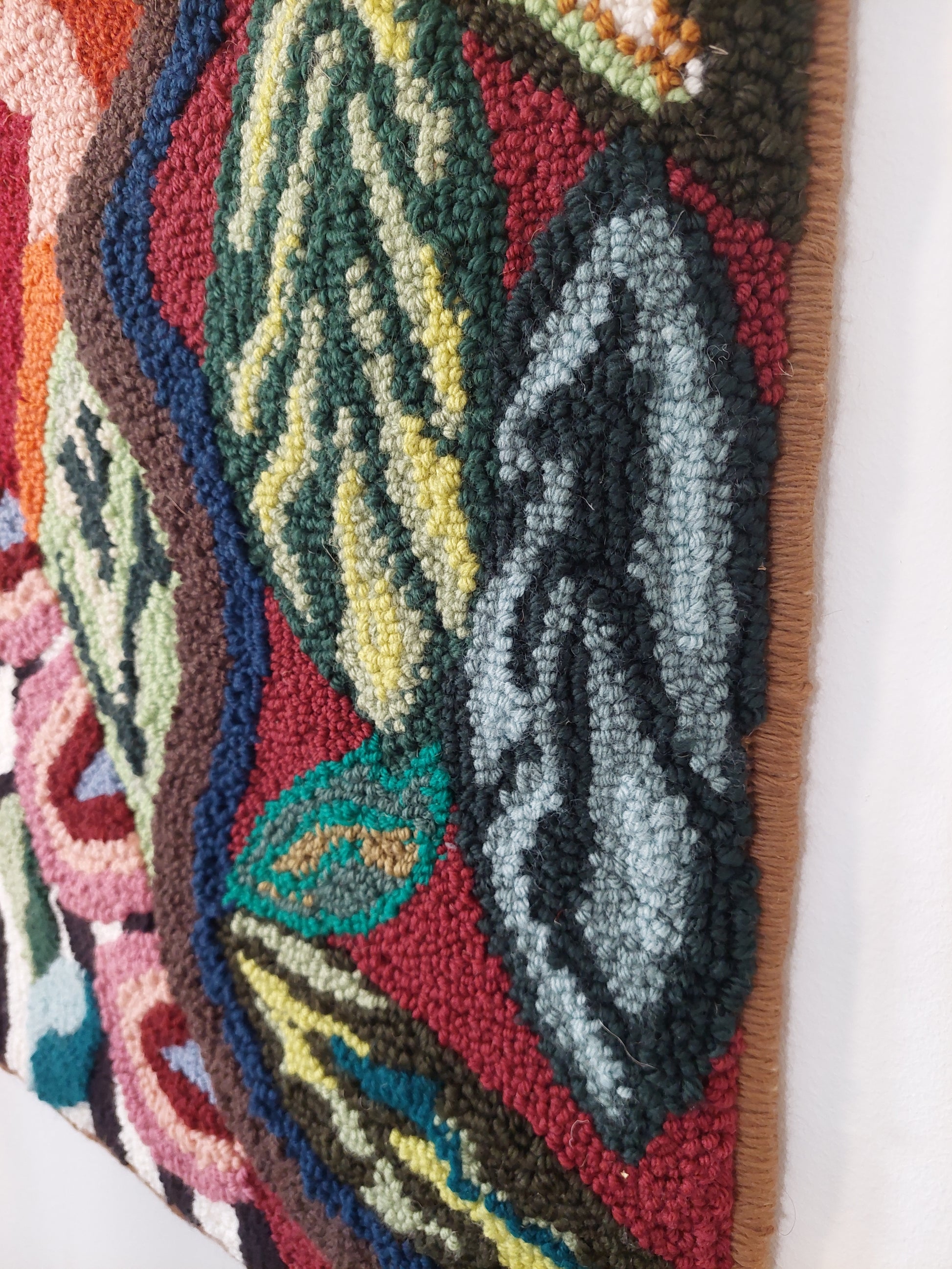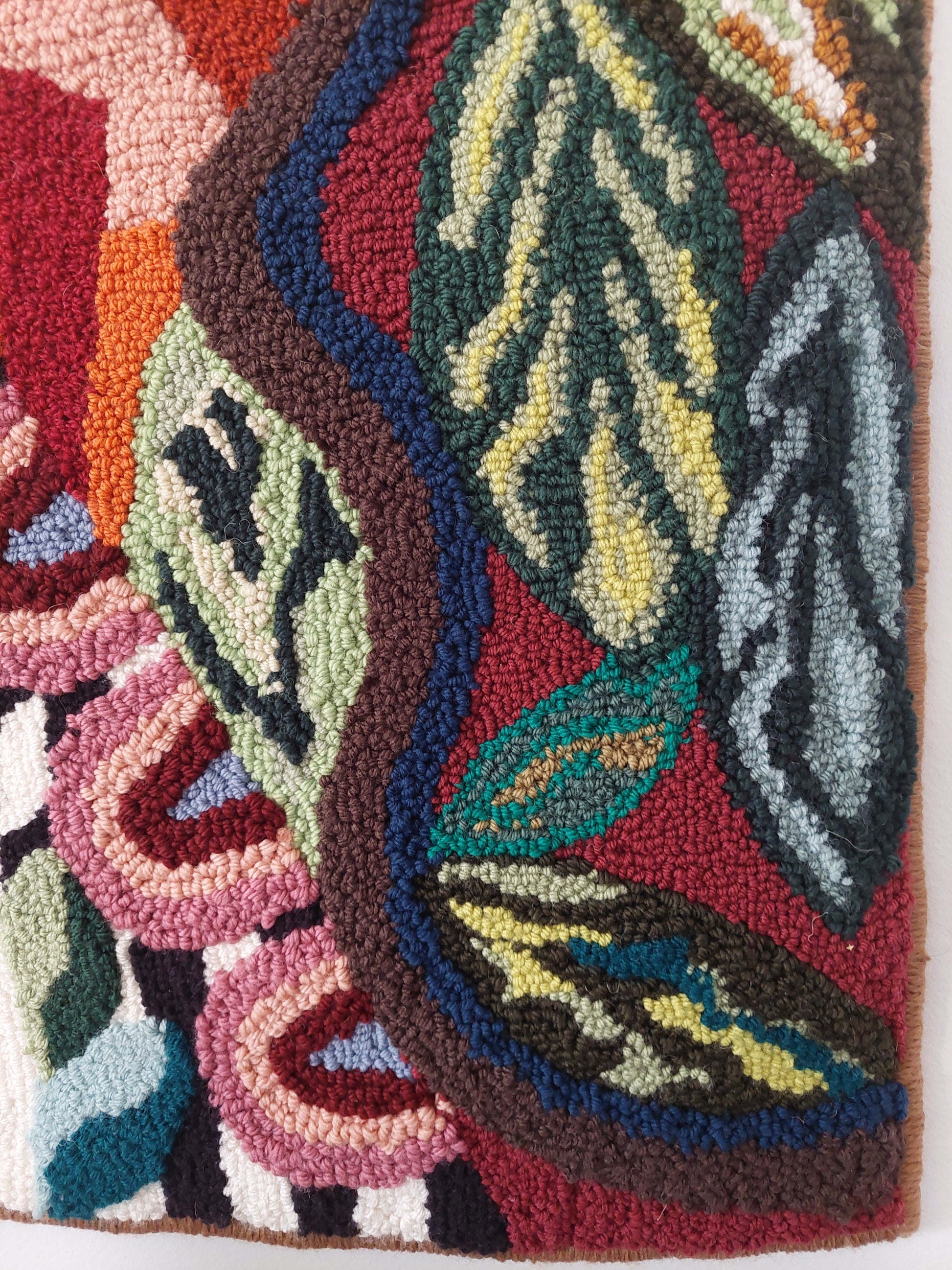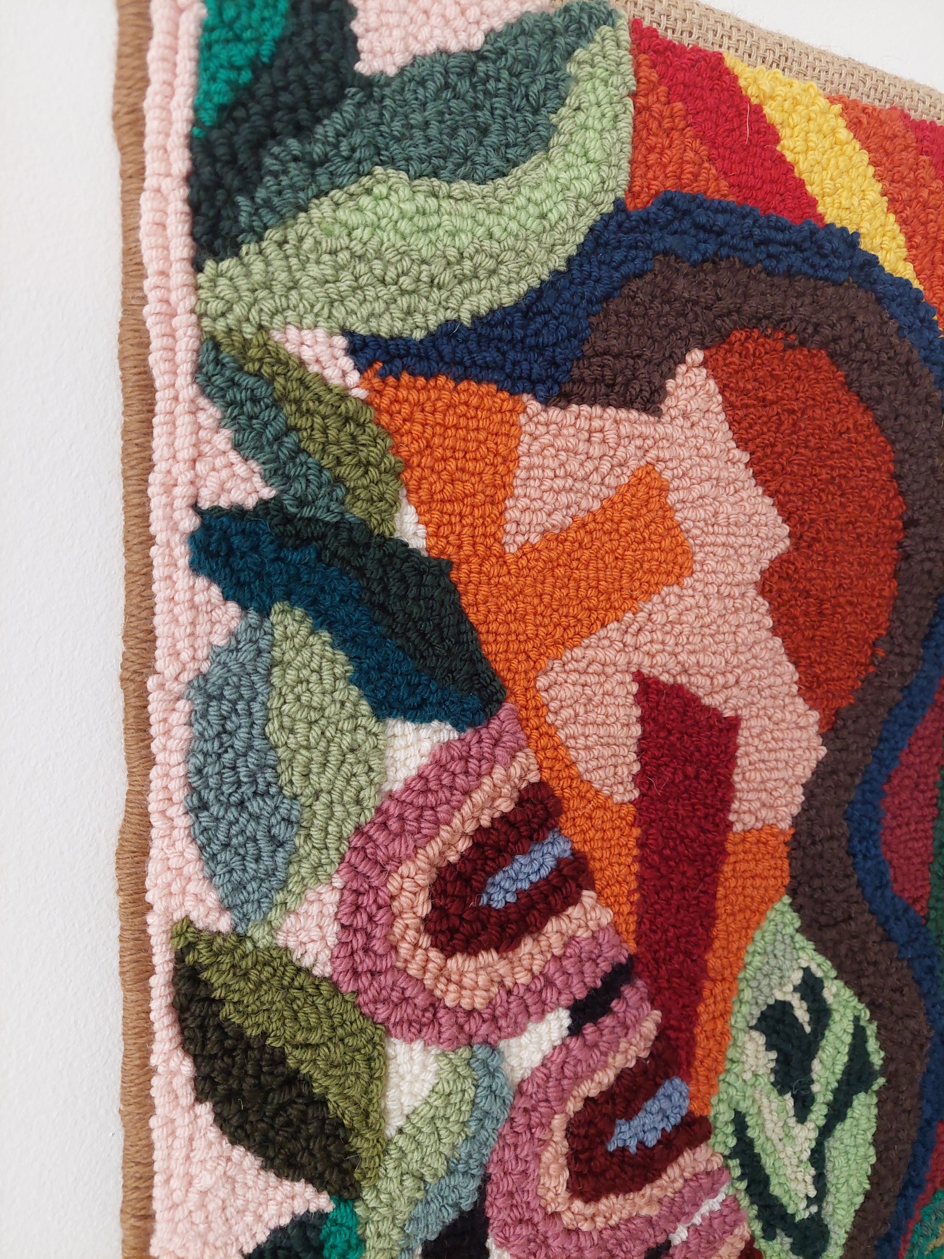 This rug was embroidered in a jute fabric with a special weave called arraiolo, a traditional embroidery technique used by Portuguese embroiderers.