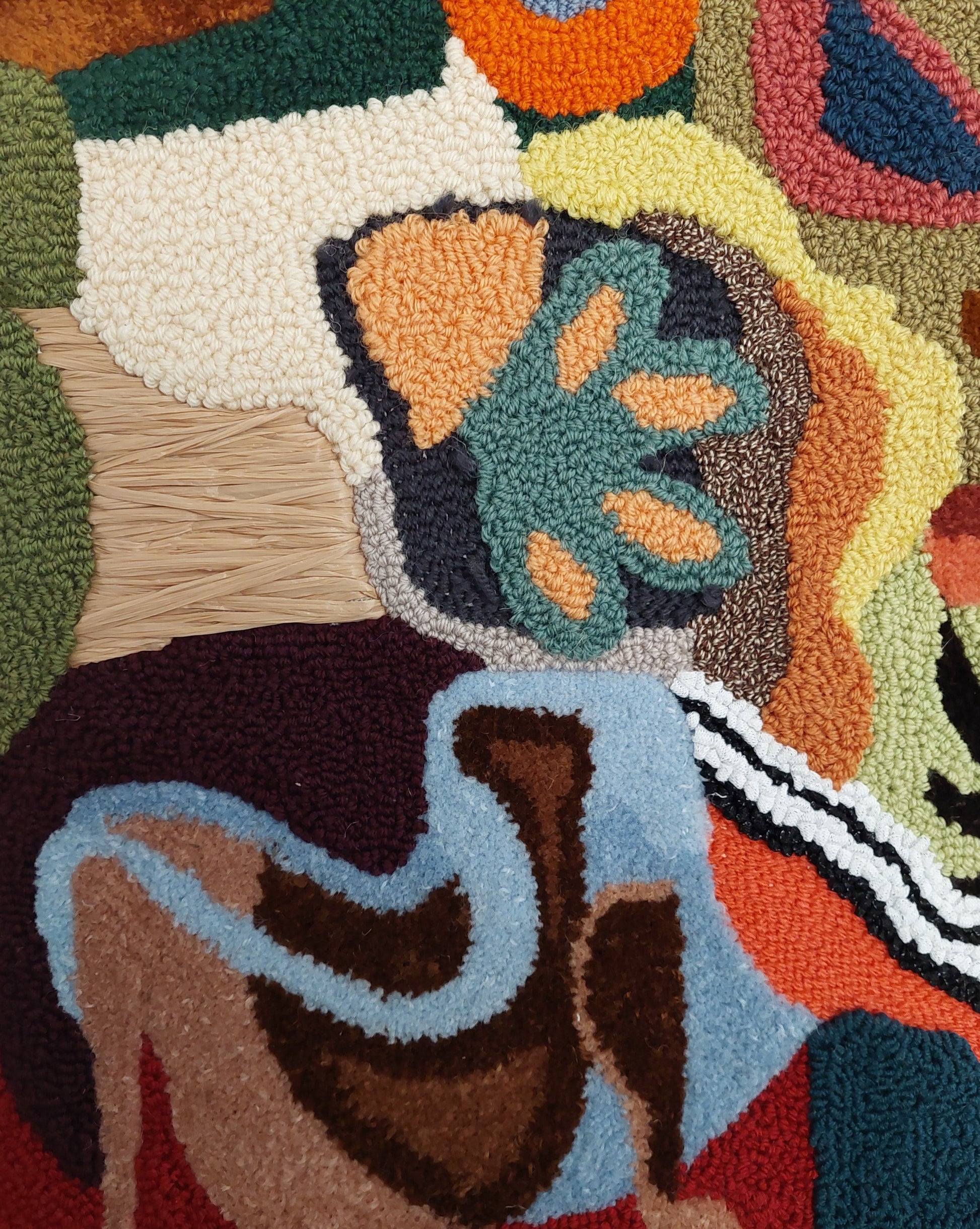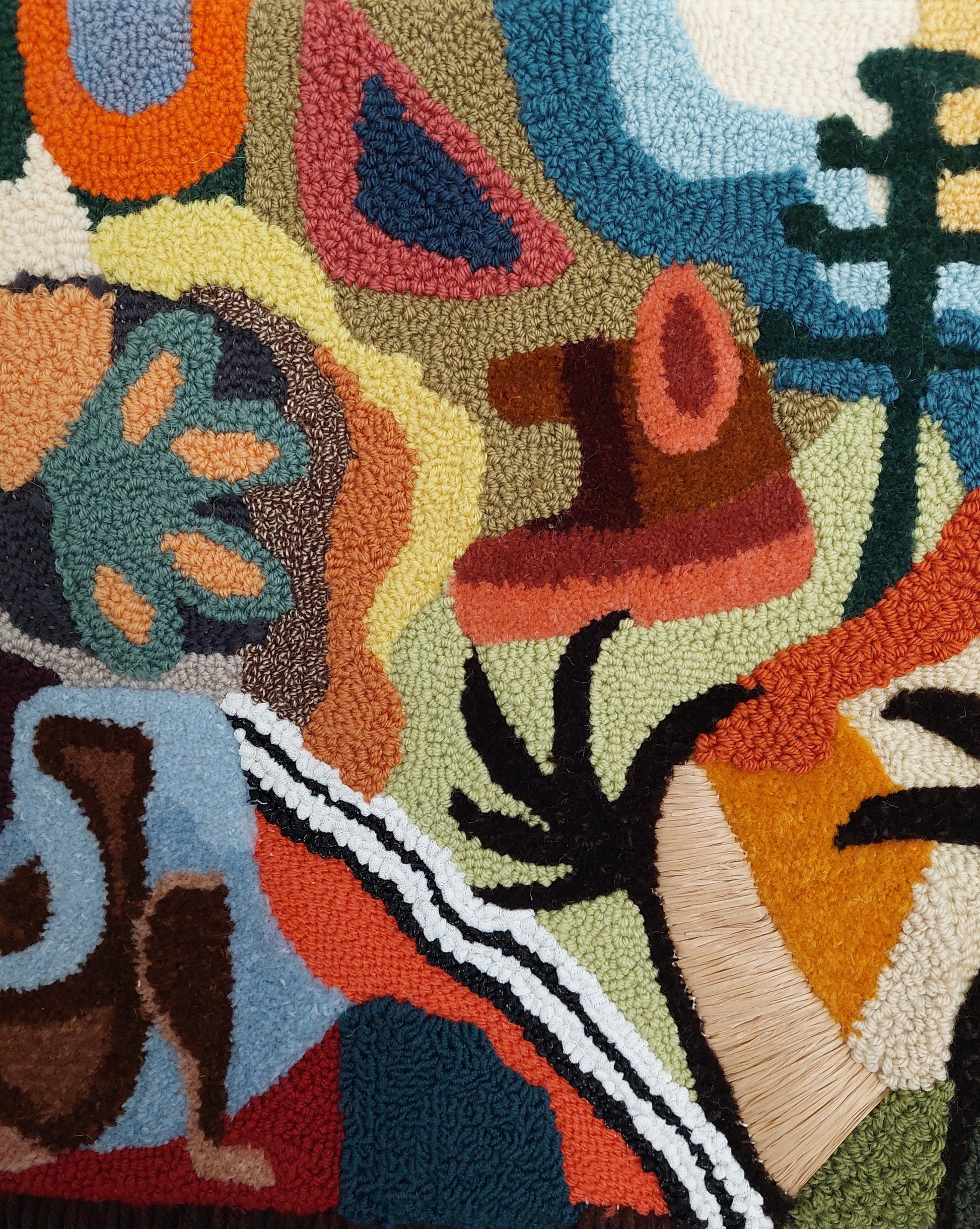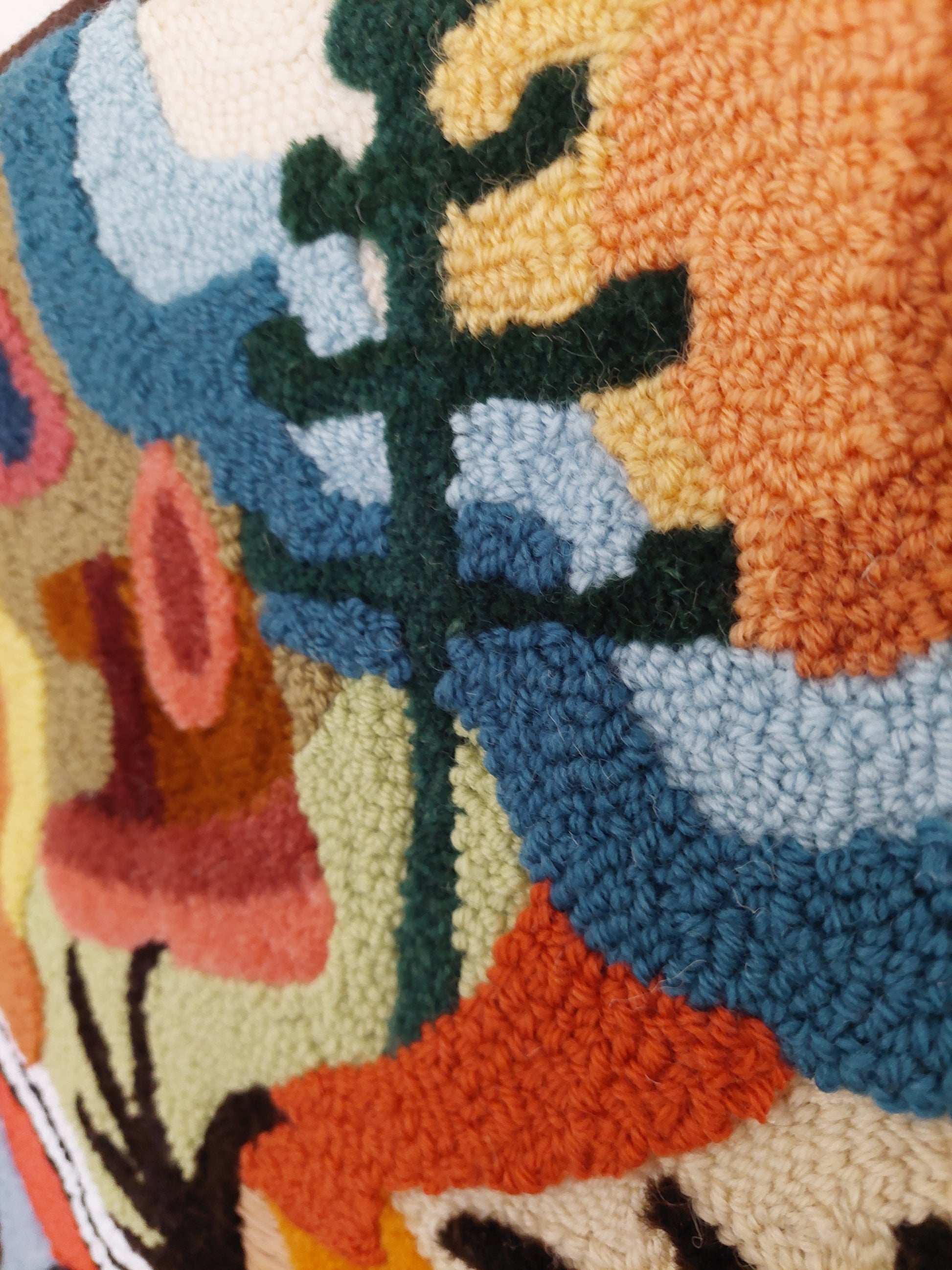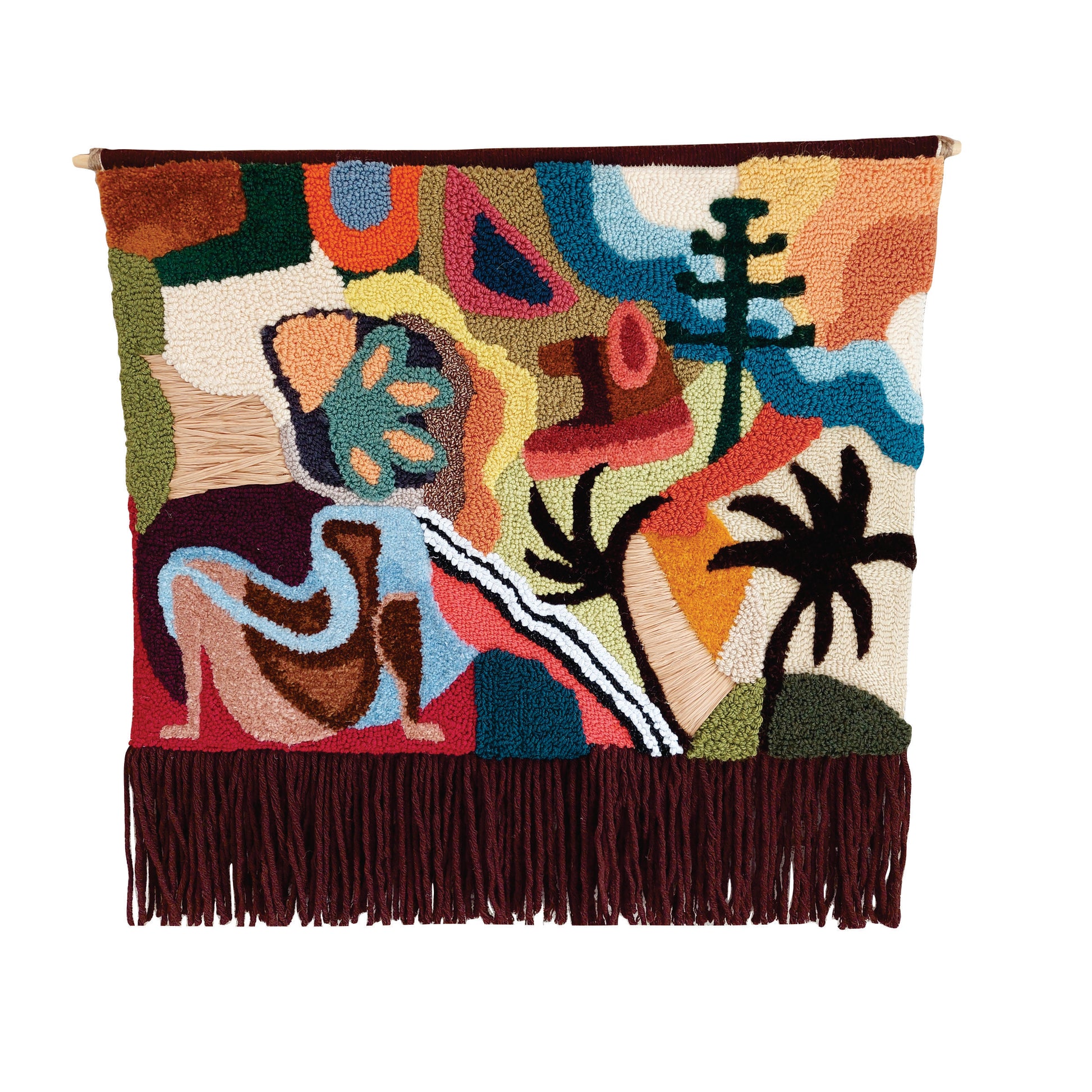 This wall rug features an abstract design with elements that refer to different types, colors and textures. A great option for a foyer combined with a rustic sideboard.