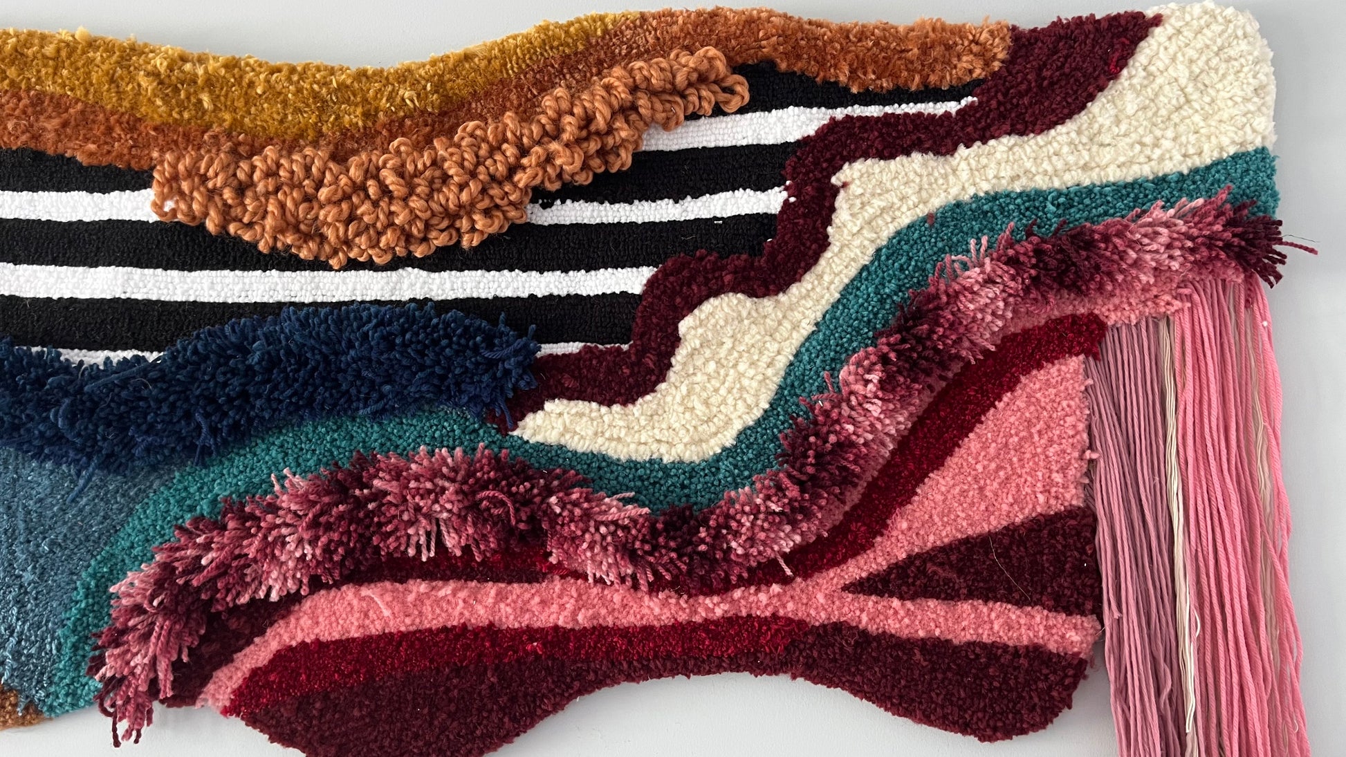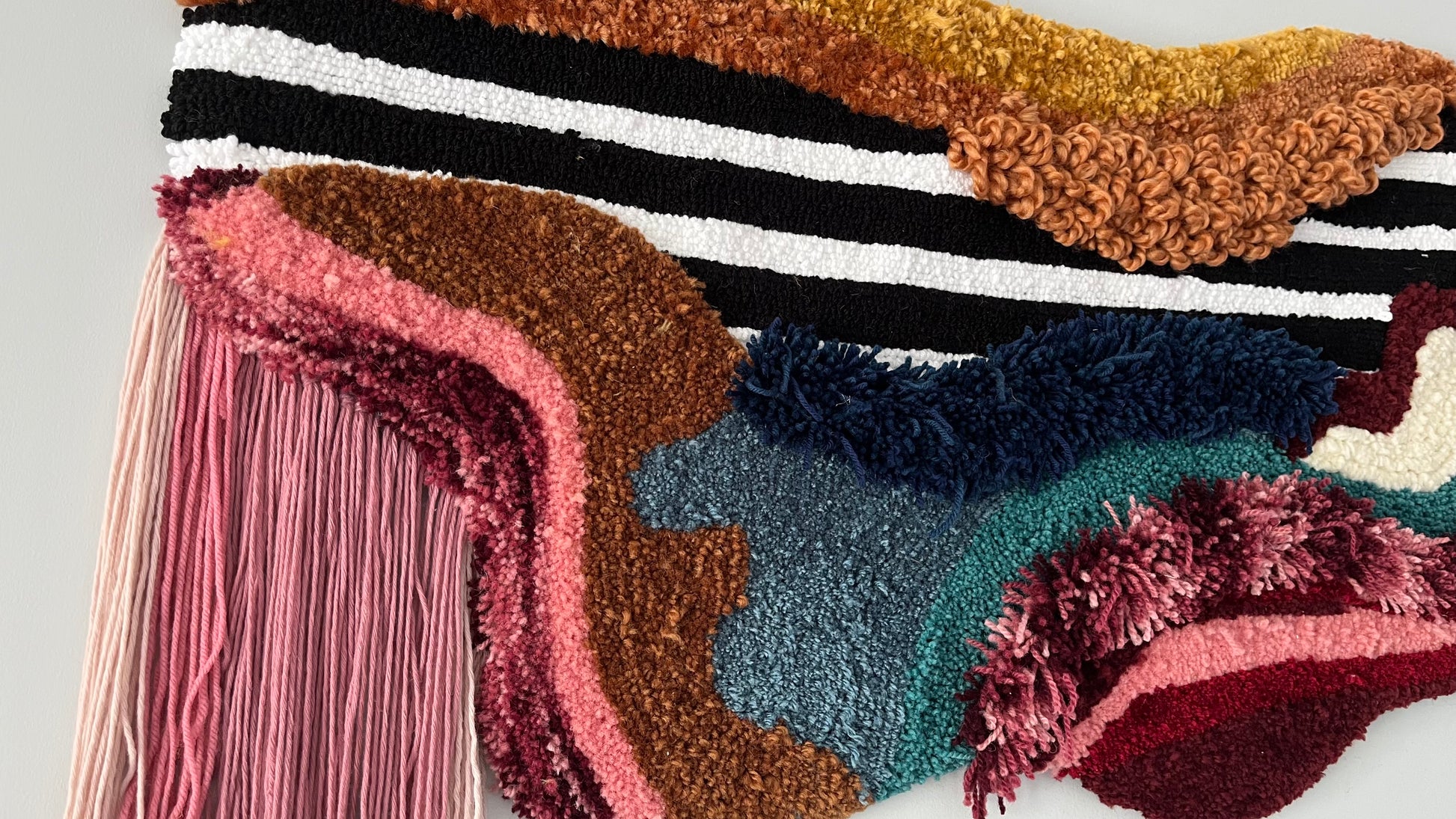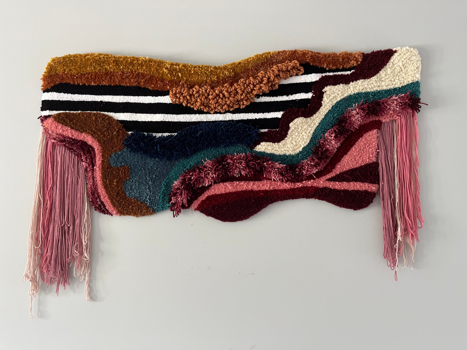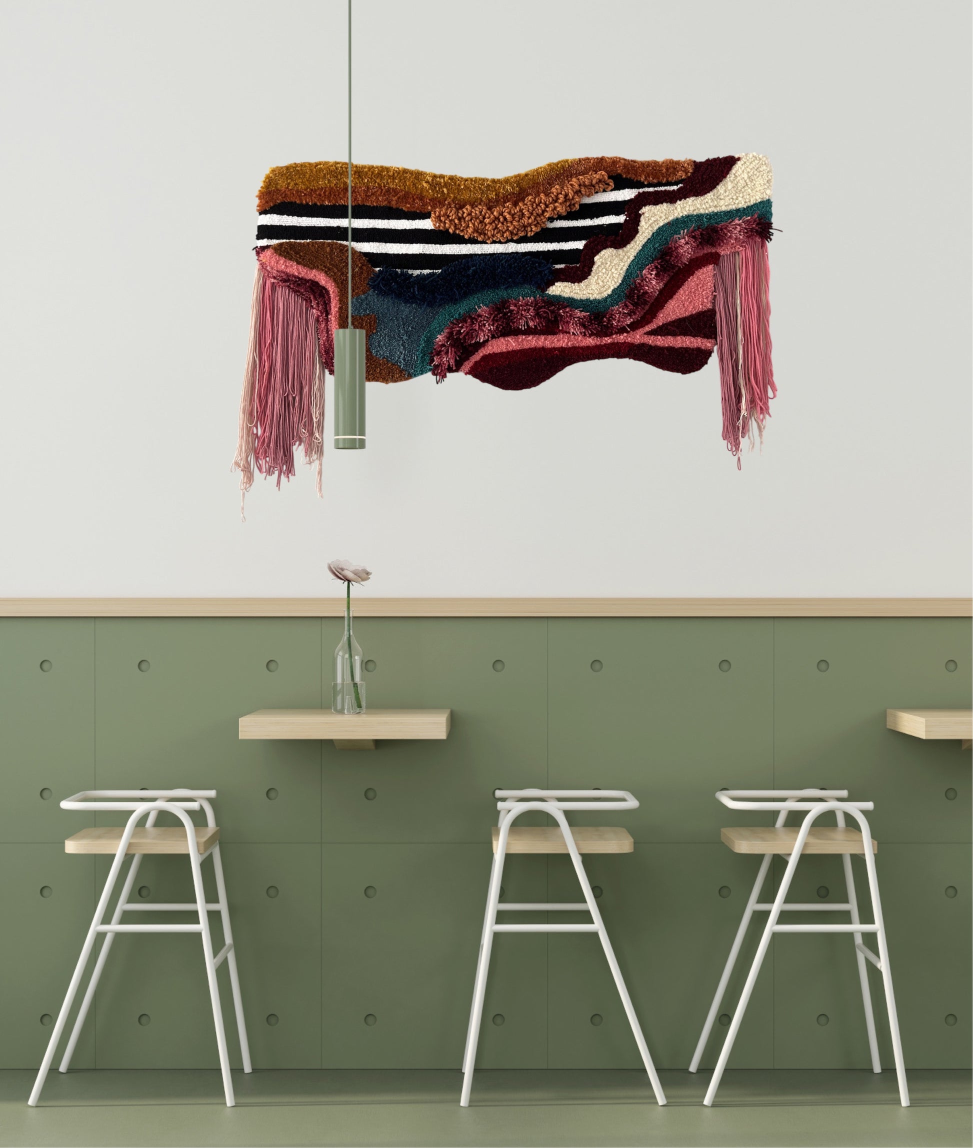 Bold, vibrant, and full of movement — this handmade wall rug is a celebration of color, texture, and artistic freedom. Carefully crafted using a combination of tufting techniques, this piece features rich velvet-like yarns and playful fringe details in deep burgundy, mustard, teal, rose pink, and cream, contrasted by striking black and white stripes.